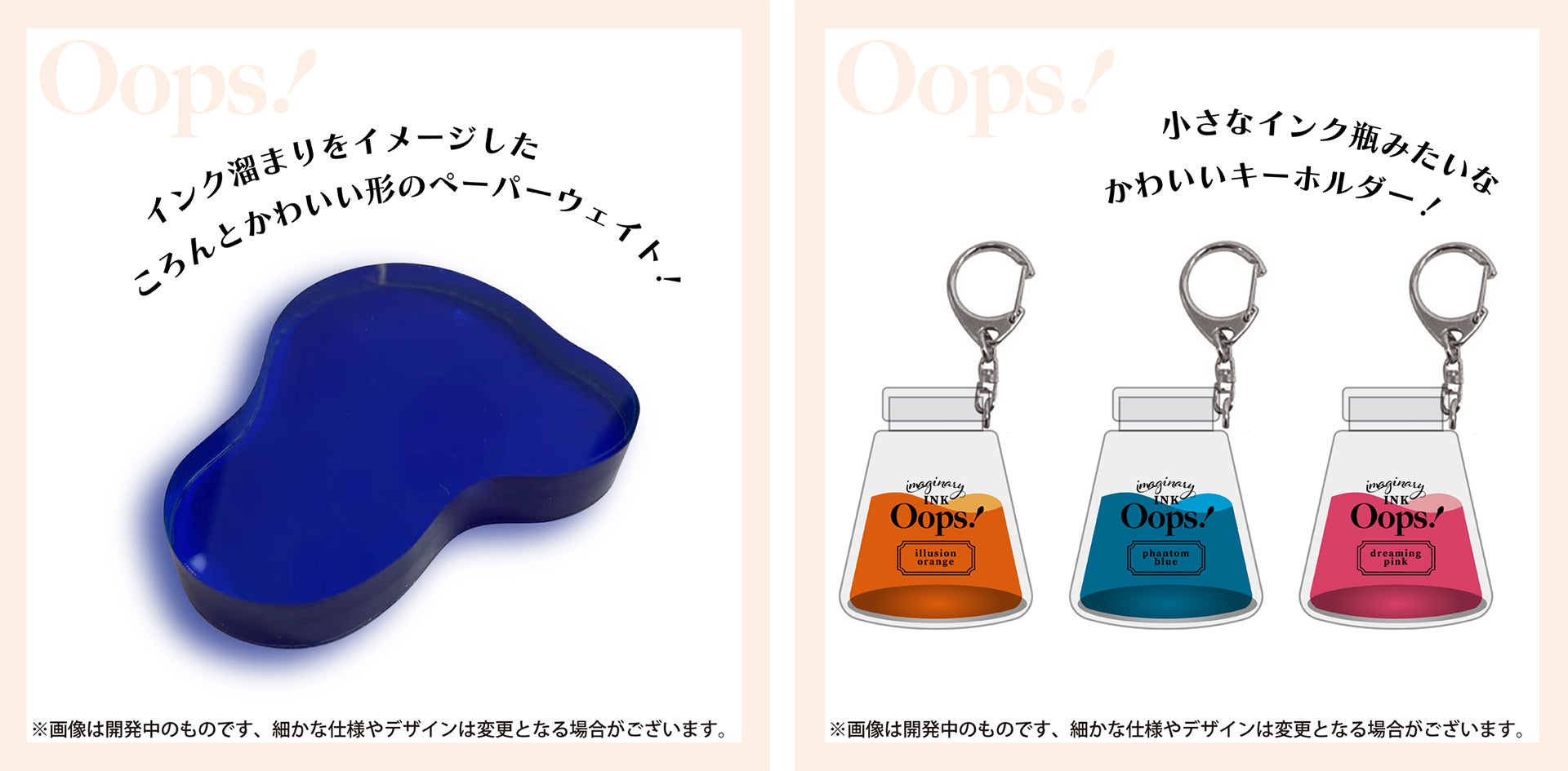 (右)トレーディングインク瓶キーホルダー (全3色) Oops! 各550円(税込)