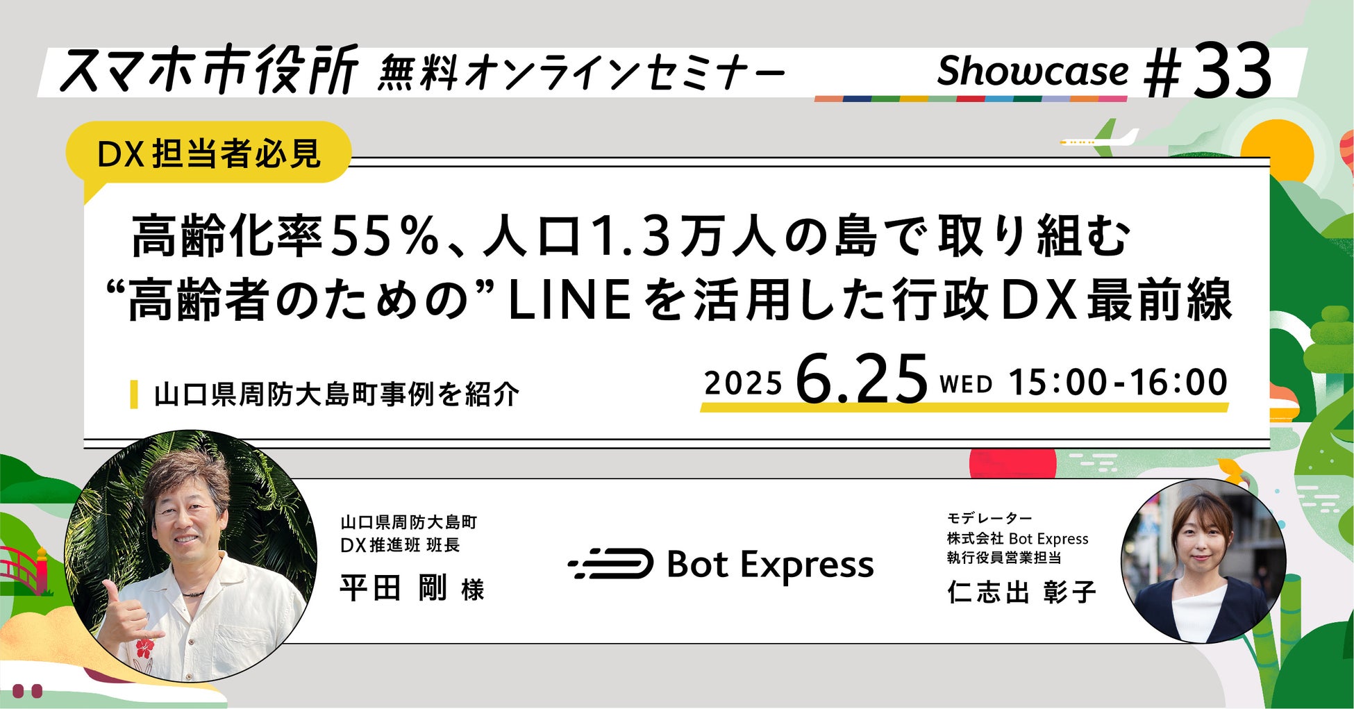 株式会社Bot Express(本社:東京都港区、代表取締役:中嶋 一樹、以下 Bot Express)は、官公庁・地方自治体のDX事例を共有する無料オンラインセミナー「Bot Express Showcase」を毎月開催しています。6月25日(水)の開催が決定しましたのでお知らせいたします。テーマは「高齢化率55%、人口1.3万人の島で取り組む“高齢者のための” LINEを活用した行政DX最前線」。山口県周防大島町 政策企画課 DX推進班平田様にご登壇いただき、企画の進め方、庁内調整、実装方法、町民の利用状況などご共有いただきます。