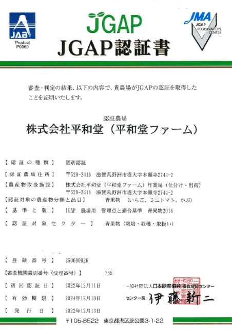 株式会社平和堂(滋賀県彦根市、代表取締役社長執行役員:平松正嗣)が運営する平和堂ファームは、一般社団法人日本能率協会審査登録センターが行う【JGAP認証審査】において、2022年12月11日(水)にJGAP認証を取得しましたのでお知らせいたします。