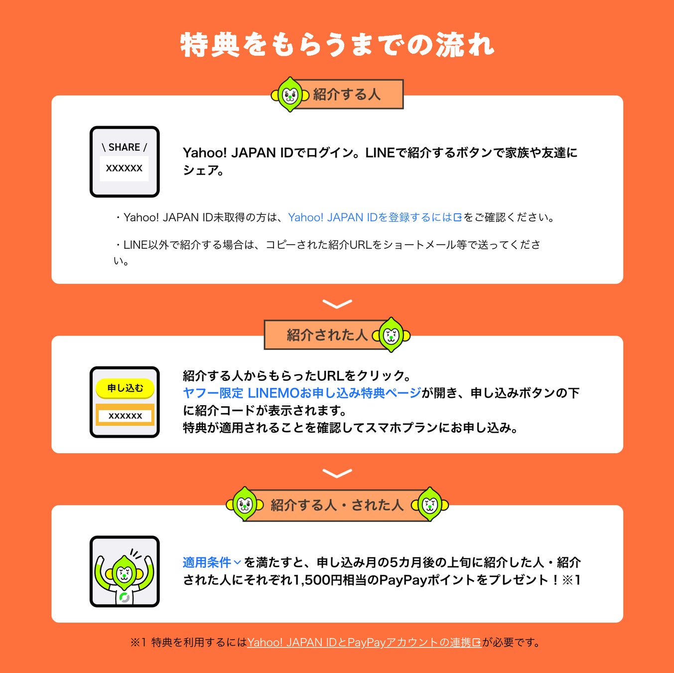 紹介する人が本特典のサイトにてYahoo! JAPAN IDでログインし、サイトに表示される紹介コードを、まだ「LINEMO」を利用したことがない友だちや家族などに紹介します。紹介された人が当該紹介コードを使用し「LINEMO」の「スマホプラン」に新規または他社からの乗り換え(MNP)で申し込むと、紹介した人にも紹介された人にも1,500円相当のPayPayポイントが付与されます。