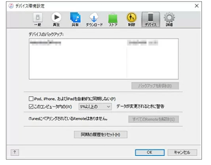 Step2:メニューの「iTunes」から「環境設定」をクリックし、「デバイス」を開きます。