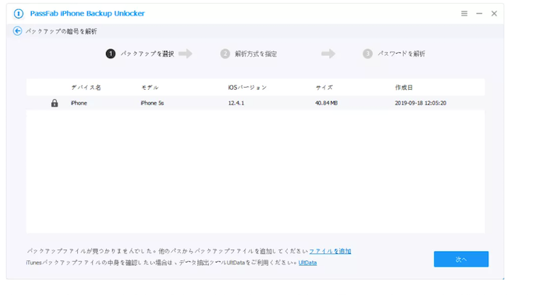 Step2:パソコンに保存されているすべてのiTunesバックアップが自動的に検出され、一覧に表示されます。暗号化されたバックアップファイルを選択し、「次へ」をクリックします。