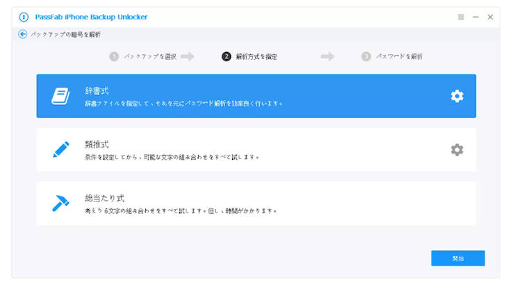 Step3:3つのパスワード解析タイプが表示されますので、適切なものを選択します。「開始」をクリックしてパスワード解析作業を開始します。