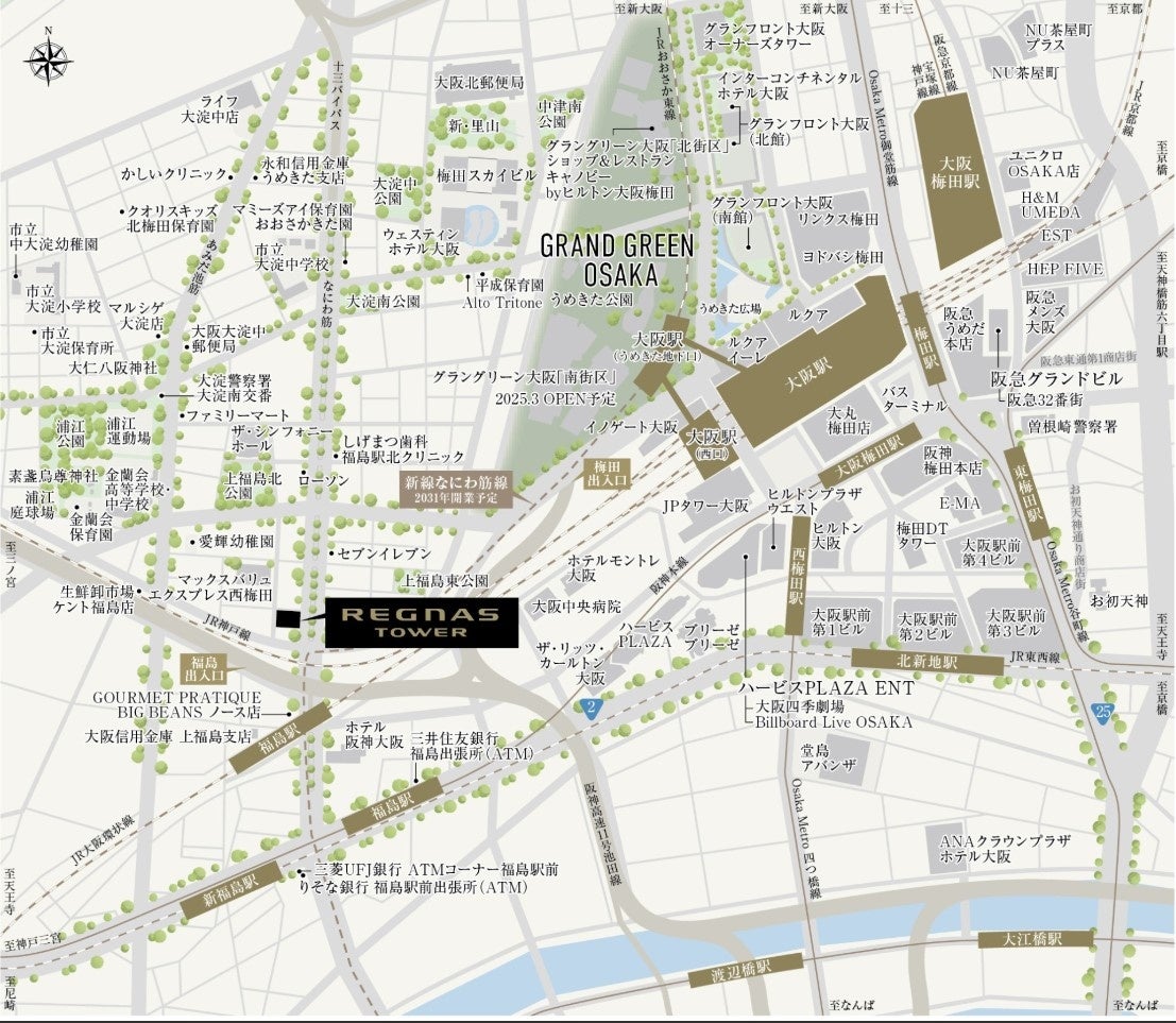 本物件が位置する場所は、大阪駅北地区にある再開発区域「うめきた2期区域」の西側にあるエリアで、通称「新梅田」と呼ばれています。最寄り駅であるJR大阪環状線「福島」駅より徒歩3分、JR「大阪」駅より徒歩10分、グラングリーン大阪の南街区まで徒歩圏で、進化を感じながら、ここでしか味わえない瞬間を享受できます。また、2025年には大阪・関西万博を控えており、今後さらに盛り上がりが期待される関西エリア・大阪の中心に本物件は誕生いたします。