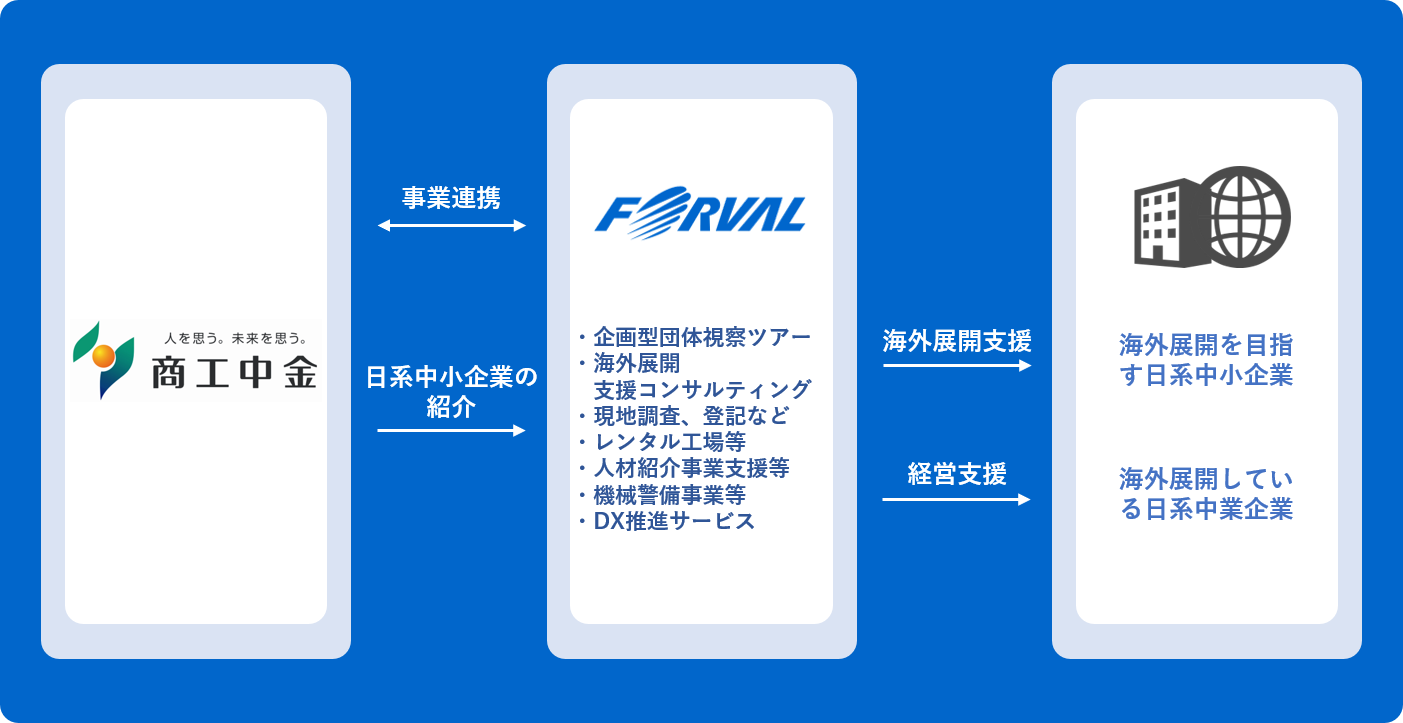 本契約は商工中金の顧客である海外展開や海外運営に課題を有する日系中小企業に対して、海外展開支援の他、すでに進出済みの企業様の海外拠点の経営支援を実施し、併せて、国内・海外問わず経営効率化を図っていきます。