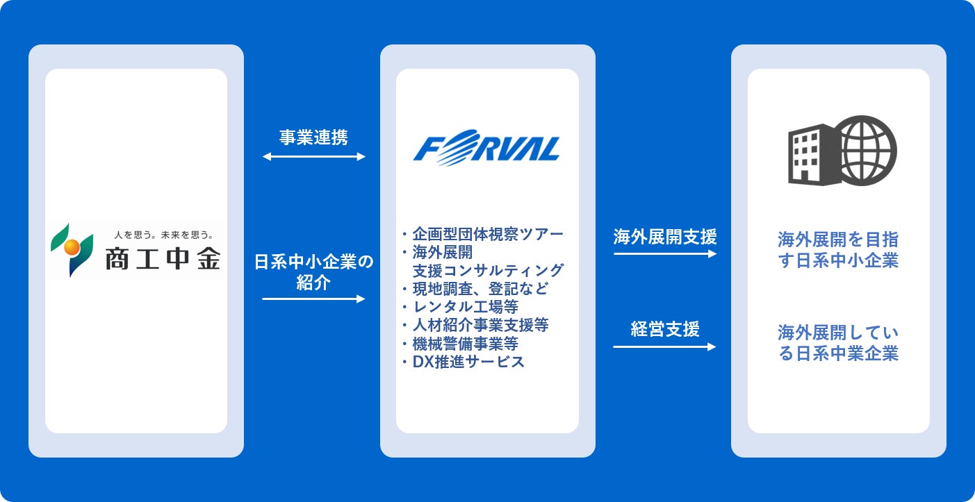 こうした中、海外に6社1拠点を持ち、日系中小企業に対し海外支援も行うフォーバルはタイを基軸としたASEAN地域へのDXソリューションを提供しており、そこでの商工中金との取り組みを評価され、今回の契約締結に至りました。