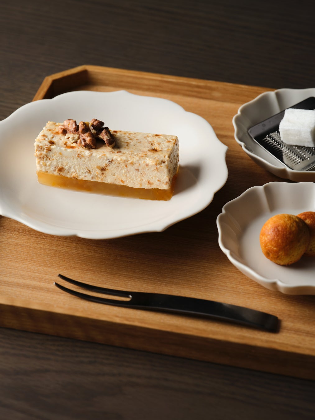 長野県茅野市に伝わる食文化である「凍み(しみ)」と、郷土料理「天寄せ(てんよせ)」を掛け合わせた2層のヌガーグラッセをご用意。ヌガーグラッセには茅野産の胡桃、天寄せにも地元で生産された棒寒天とりんごのコンフィチュール、ほおずきジャムを使用し、茅野市の伝統の味を一品に凝縮しました。横に添えられている伝統的な保存食「氷餅」を削ると、より風土を感じられる味わいへと変化します。ほんのりと塩味のきいた信州味噌とそば粉のマフィンと一緒にご提供いたします。