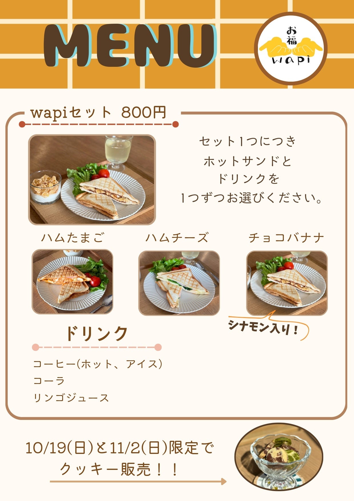 当日は、子どもたちがメニュー考案したホットサンドとドリンクをセットにした“wapiセット”を店内でお召し上がりいただけます。