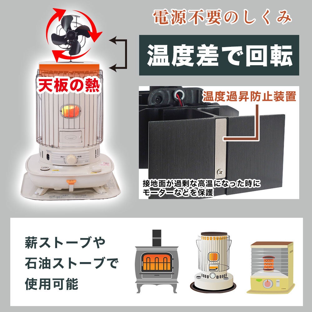 本製品はストーブの熱で羽根を回転し温かい風を循環させるストーブファンです。
