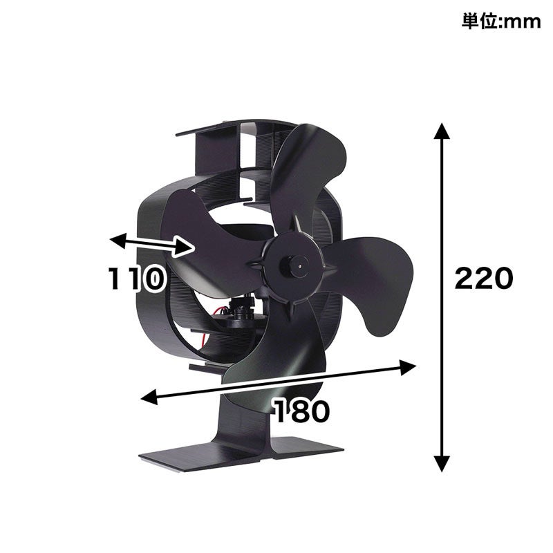 本体サイズ幅180×高さ220×奥行110mm。お手持ちの石油ストーブまたは薪ストーブの天面部に本製品をのせるだけでOK。本体底面部から伝わった熱をエネルギーに変換し、羽根を回転させます。電源不要の首振り機能を搭載。本体後ろの首振りスイッチがONの時、ストーブの熱を利用しファンの回転と共に本体が左右45度ずつ首を振ります。より広範囲に熱風を届けて温めることが可能。