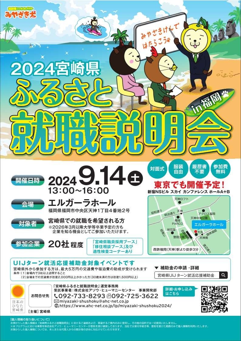 参加費無料・服装自由・履歴書不要で参加可能です。宮崎県職員採用・移住相談ブース、無料適性検査コーナーもあります。お気軽にお越しください!