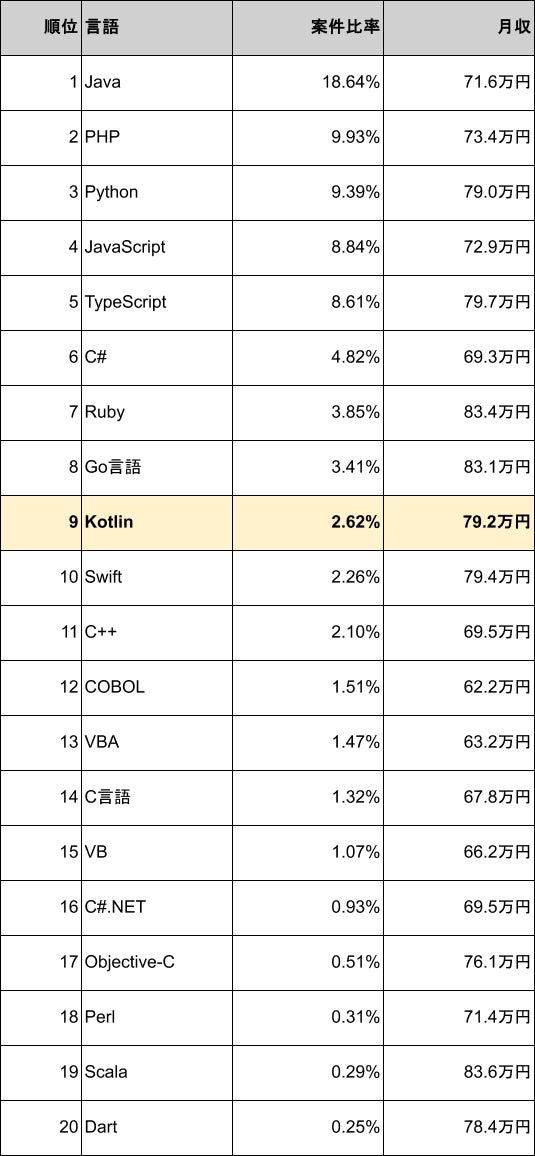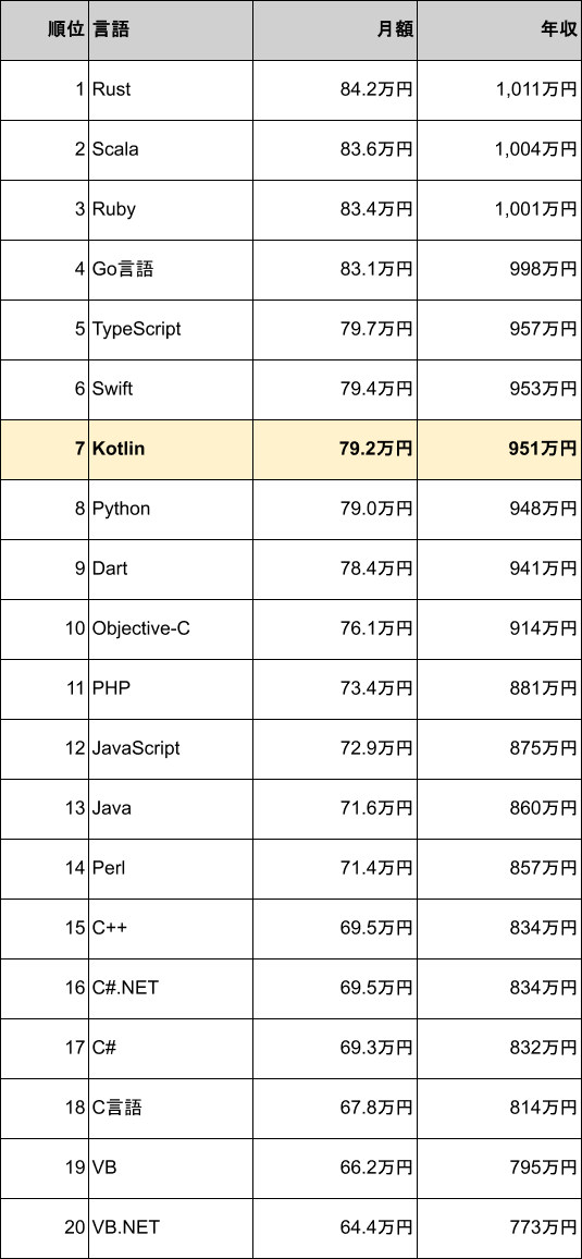 Kotlinの案件別平均年収ランキングは7位(951万円)