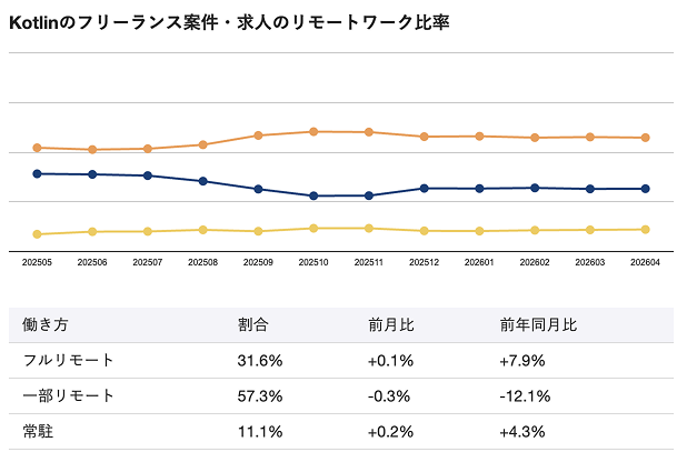 前月比ではフルリモートが0.1%増加した一方、一部リモートは0.3%減少しました。KotlinはAndroidアプリ開発やサーバーサイド開発が中心であり、個人作業との親和性が高いため、安定したリモートワーク比率を維持しています。