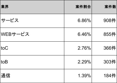 2026年4月時点のKotlin案件は、サービスが6.86%(908件)で1位、WEBサービスが6.46%(855件)で2位、toCが2.76%(366件)で3位、toBが2.29%(303件)で4位、通信が1.39%(184件)で5位となり、上位5業界で全体の約19.76%を占めます。