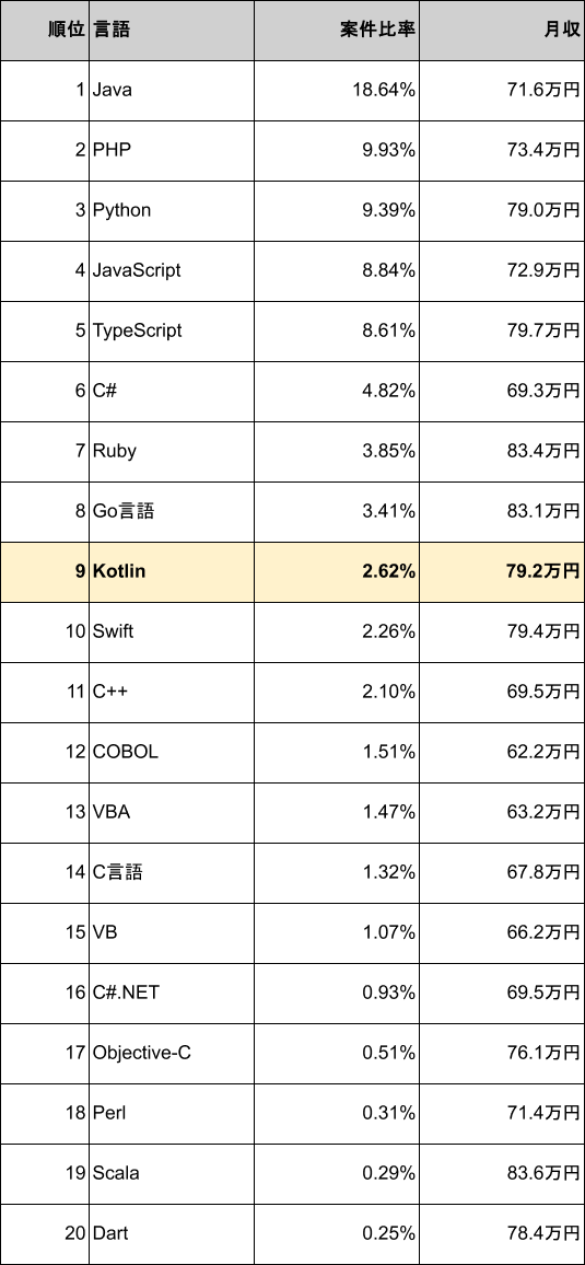 2026年4月時点でKotlinの案件は市場全体の2.62%を占め、案件数は9位、平均月額単価は79.2万円と高い水準を維持しています。