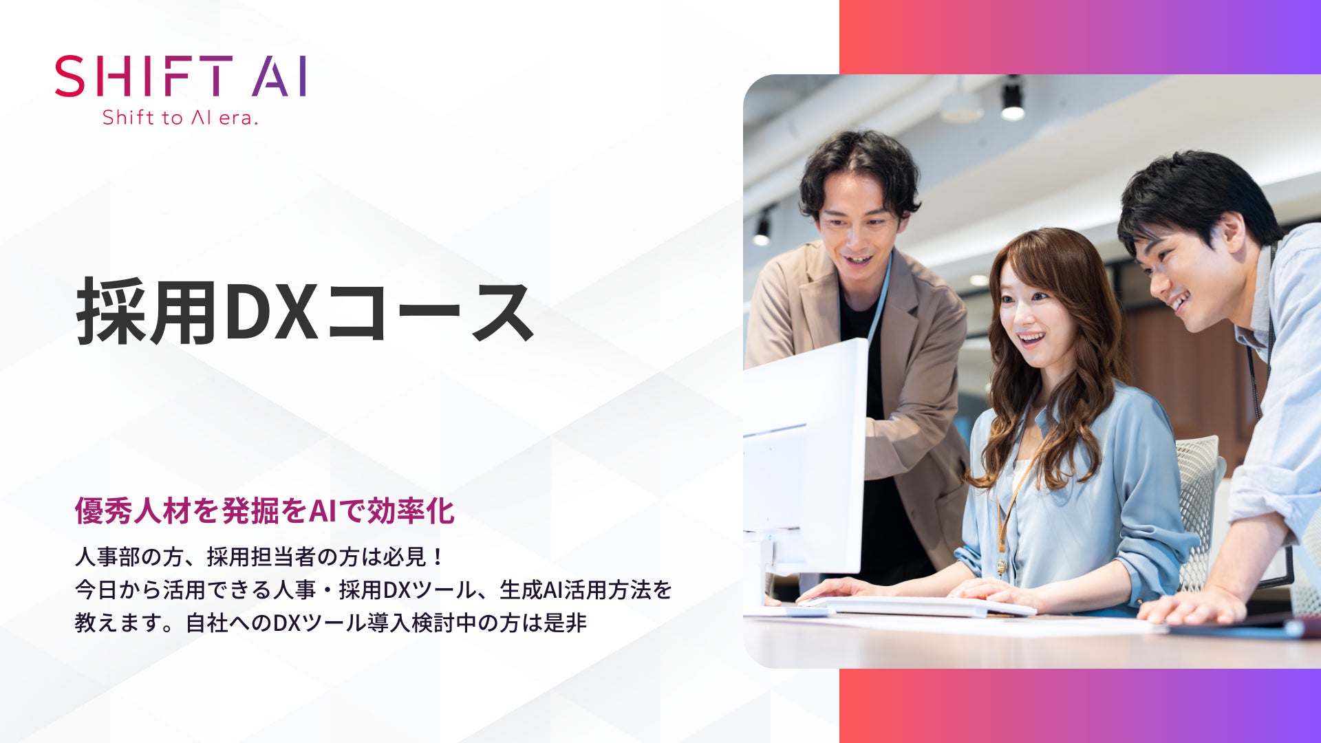 「日本をAI先進国に」を掲げAIのビジネス活用を学べるAI大学「SHIFT AI」を運営する株式会社SHIFT AI(東京都渋谷区、代表取締役 木内翔大、以下 当社 )は、DX(デジタルトランスフォーメーション)推進に必要な法人向け新サービス「採用DXコース」を2025年3月より提供開始いたします。