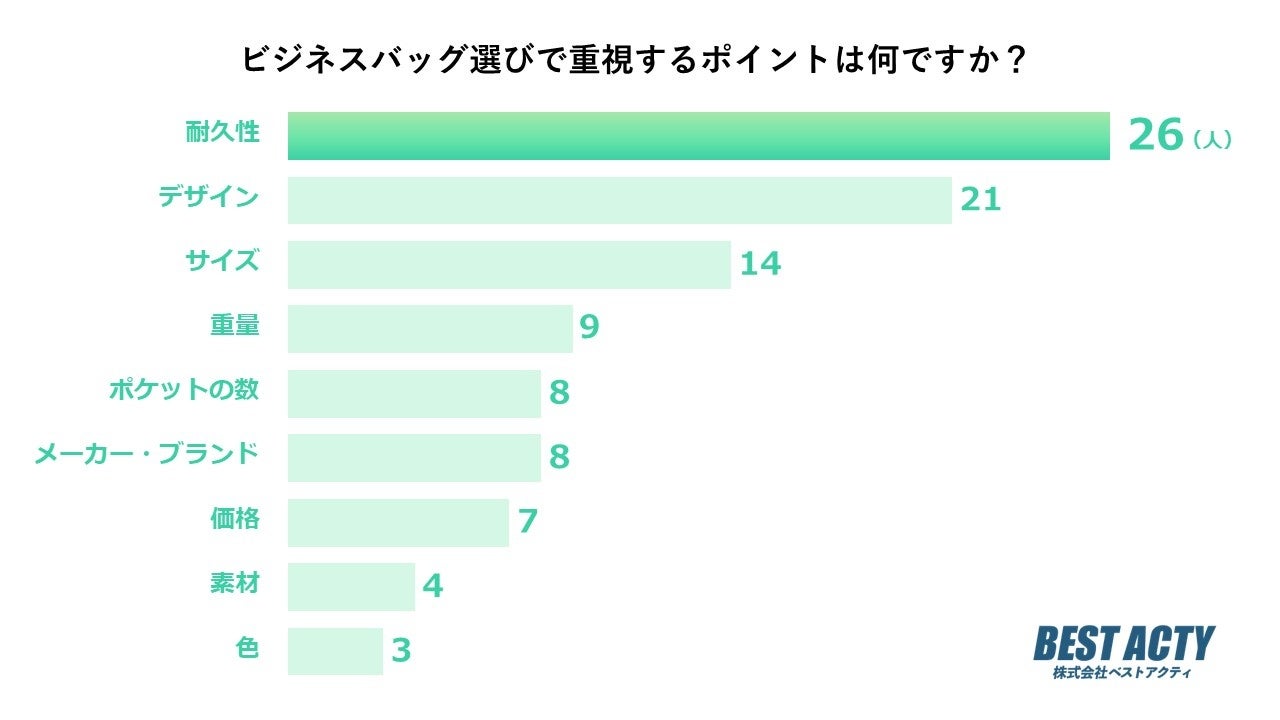 ビジネスバッグ選びで重視するポイントについて100人にアンケートを行ったところ、「耐久性」と回答する人が最も多い結果となりました。