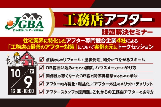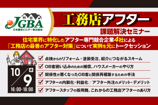 一般社団法人日本優良ビルダー普及協会(事務局:東京都港区、代表理事:田島亮、以下「JGBA」)は去る10月9日(木)、「工務店アフター課題解決セミナー」をリアルとオンラインで開催し、63名の方にご参加いただきました。