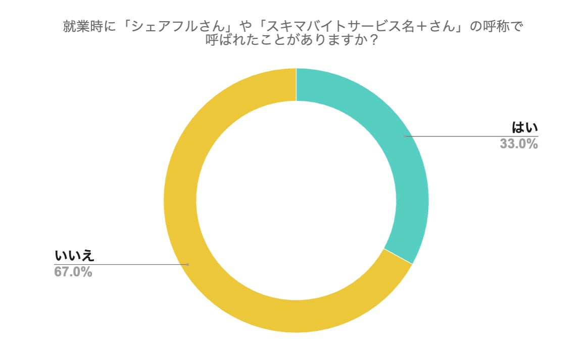 就業時に「シェアフルさん」や「スキマバイトサービス名+さん」の呼称で呼ばれたことがありますか?という質問では、約3人に1人である33.0%の人が呼ばれたことがあると回答した。