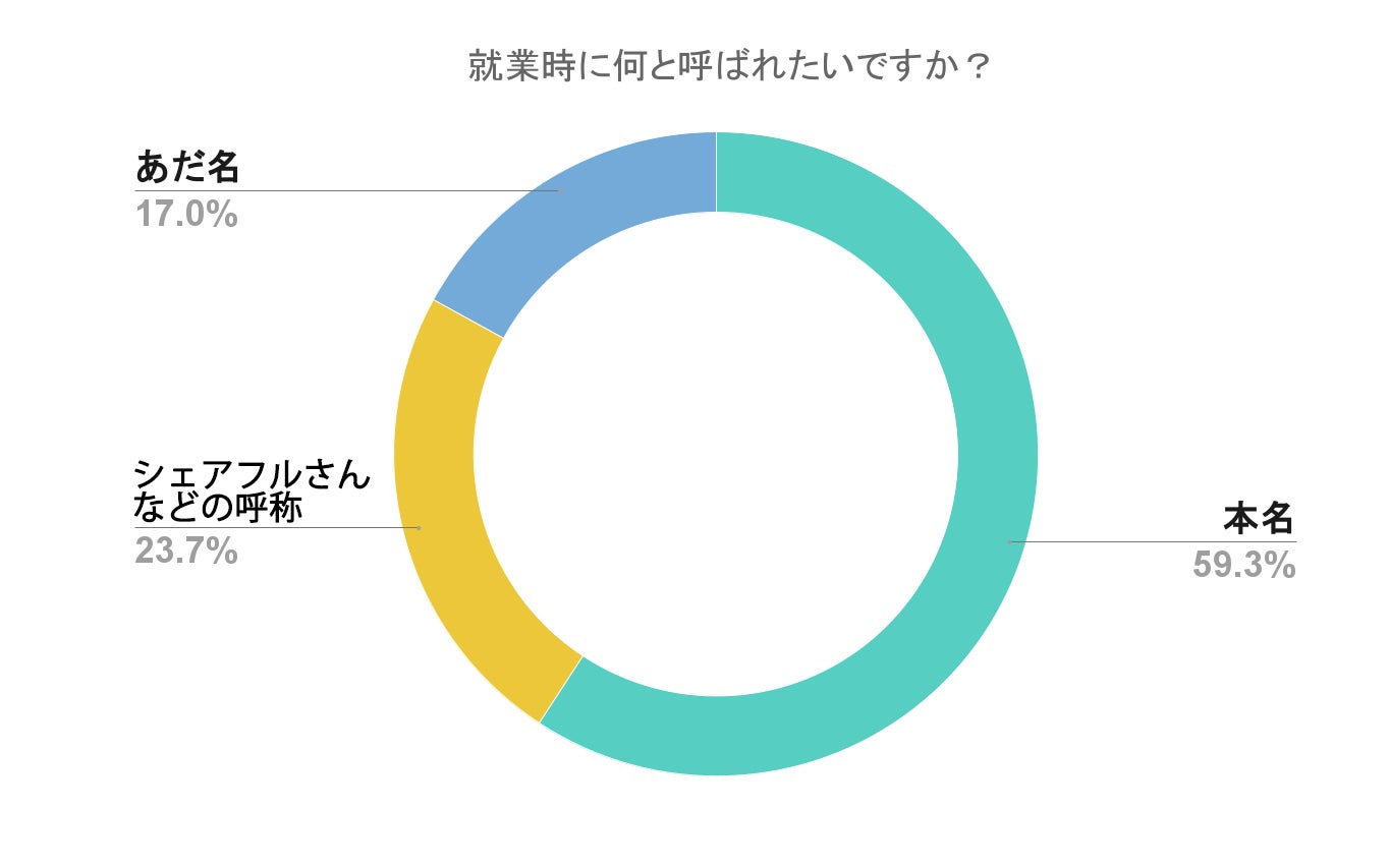 「就業時になんと呼ばれたいですか?」の質問に対し、59.3%の方が本名で呼んでもらいたいと回答した。次点で「シェアフルさん」などの呼称が23.7%、あだ名で呼んでほしいと答えた方は17.0%だった。