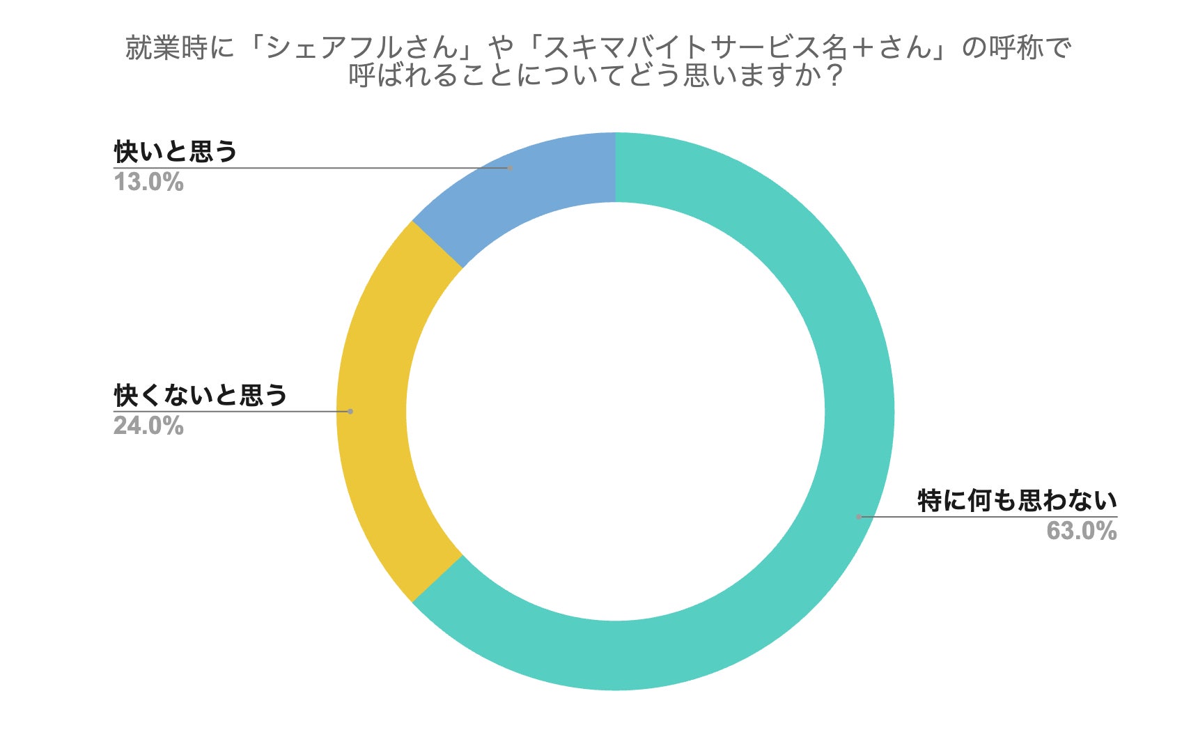 就業時に「シェアフルさん」や「スキマバイトサービス名+さん」の呼称で呼ばれることについてどう思いますか?という質問に対し、13.0%の方が「快いと思う」、半数以上である63.0%の方が「特に何も思わない」と回答した。一方で全体の約4人に1人である24%の人が「快くないと思う」と回答した。