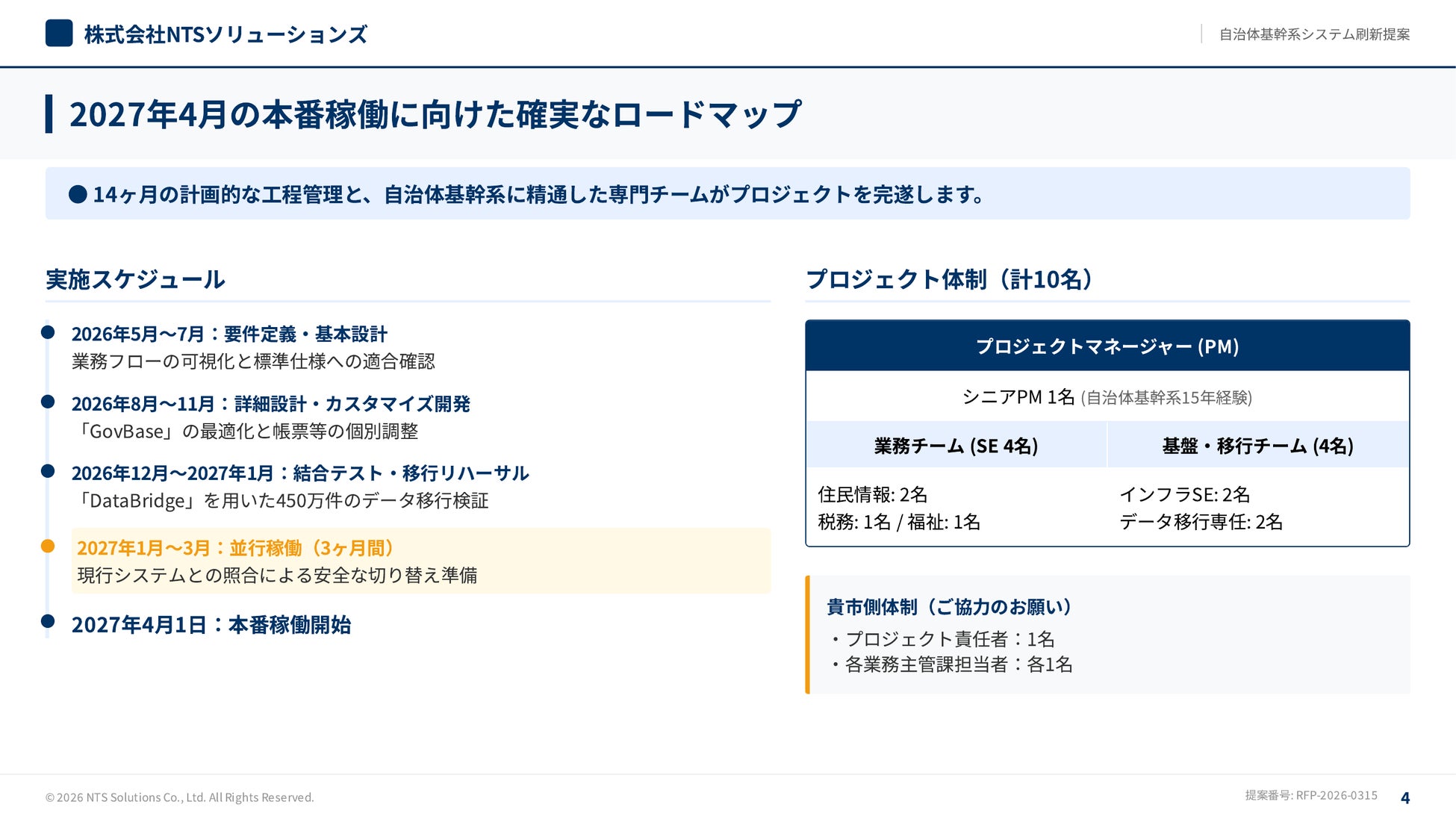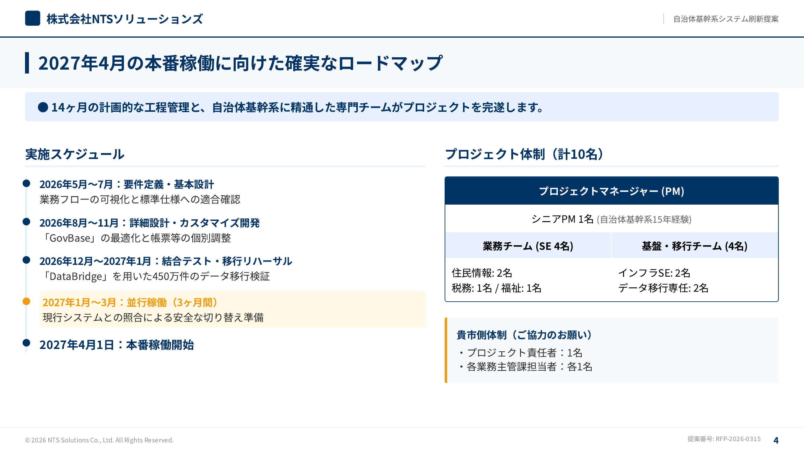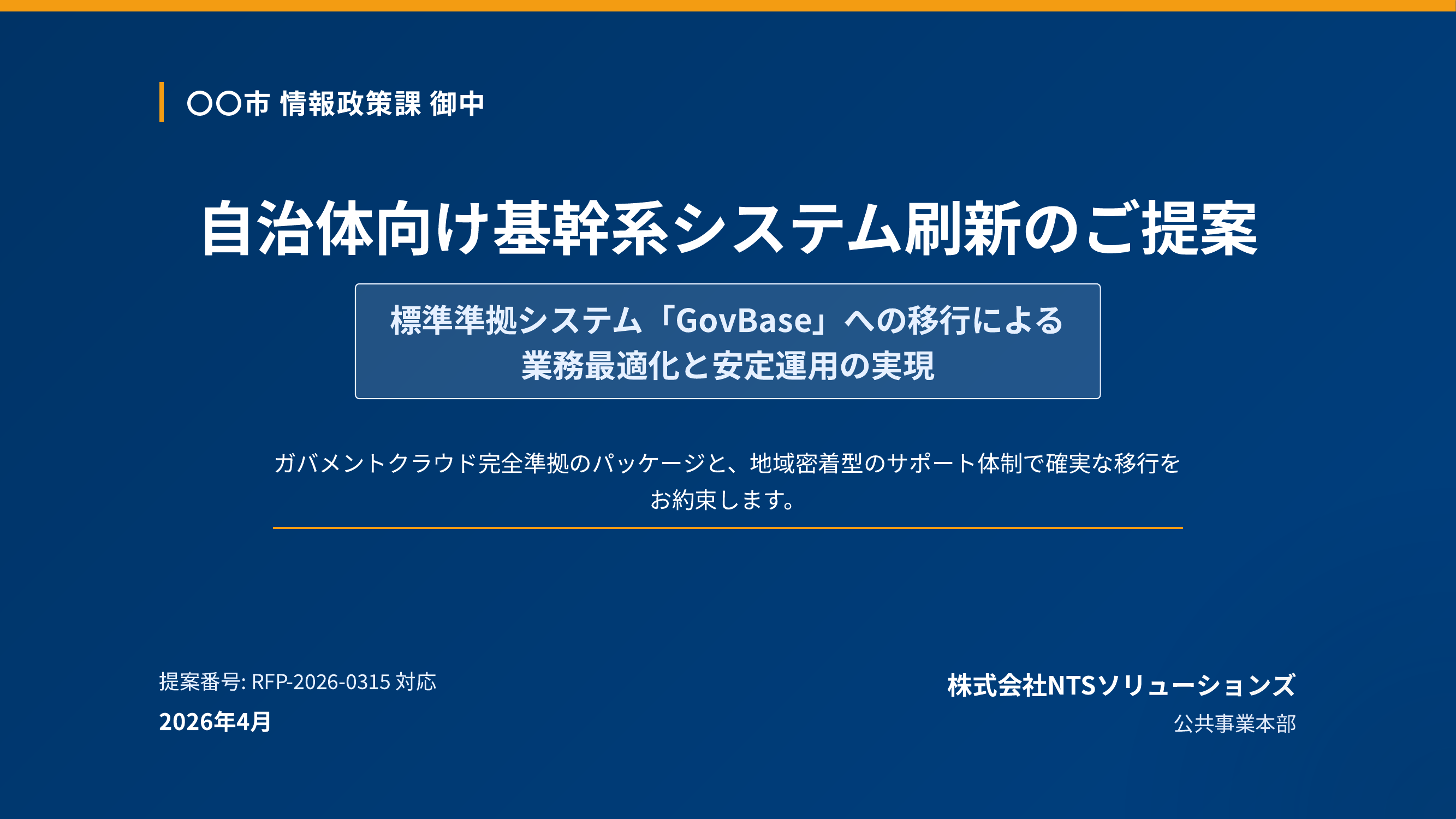4つ目は「RFP対応の提案スライド」です。RFPに記載された要件項目に沿って構成した、入札・コンペ向けの提案スライドを生成できるサンプルです。複数案件のRFPが同時期に重なると、提案スライドの作成リソースが不足し、品質を維持しながら期限内に提出することが困難になるという課題に対応しており、RFP資料PDFや過去の提案書を素材として活用することで、要件への回答を網羅した提案スライドを迅速に制作することが可能です。提案体制の限界によって応札を見送るケースを減らし、受注機会の拡大につなげられます。