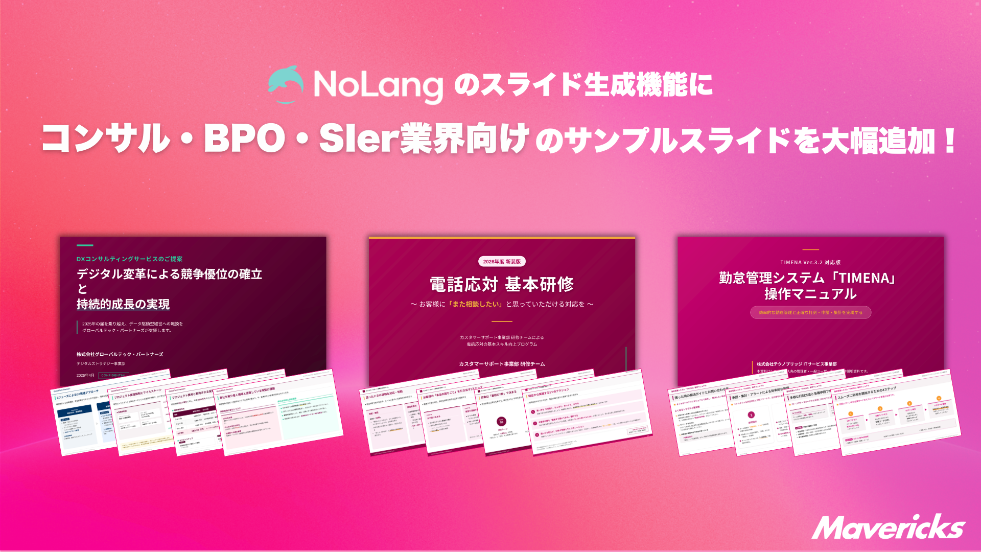 株式会社Mavericksは、動画生成AI「NoLang」のスライド生成機能にて、コンサル・BPO・SIer企業向けのサンプルスライドを追加。提案・マニュアル・研修資料の作成工数を大幅削減