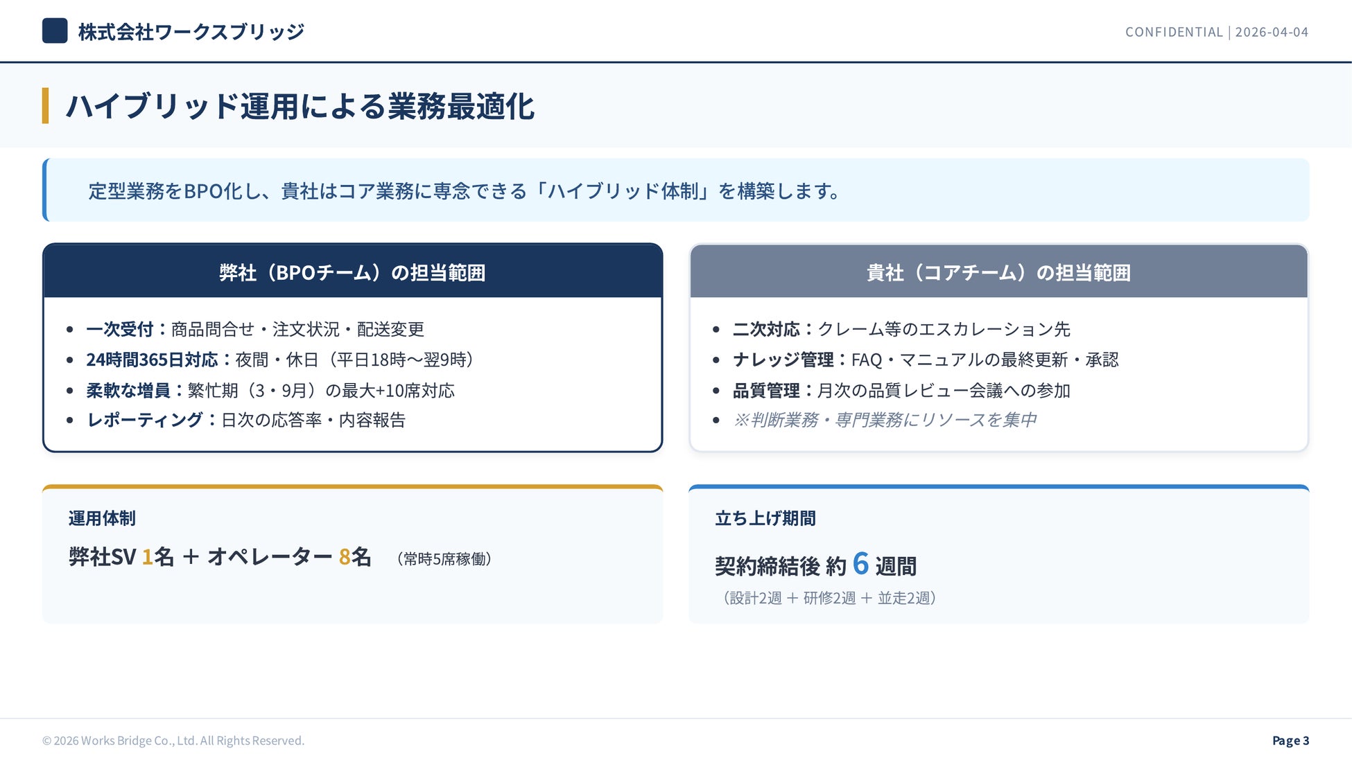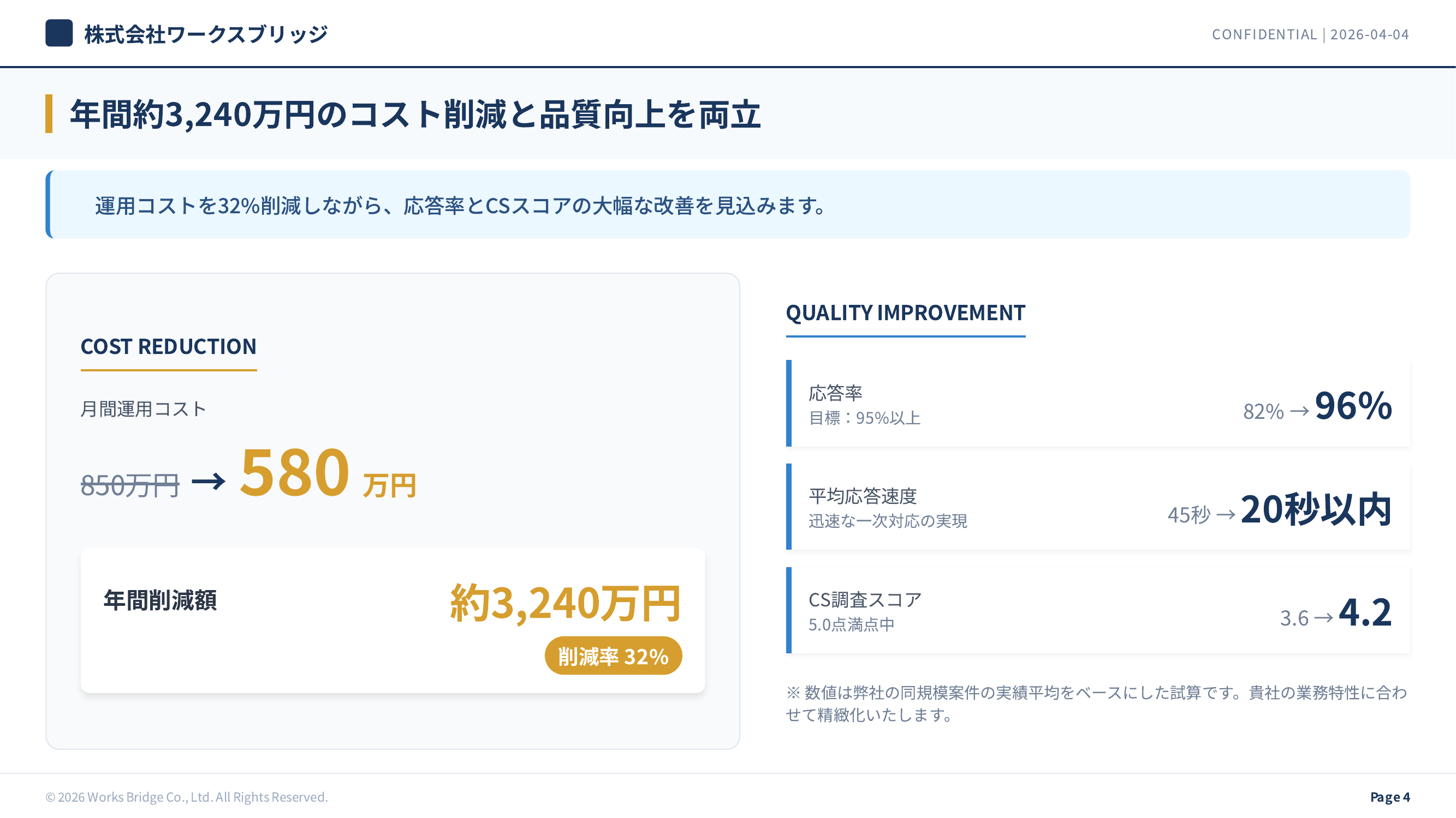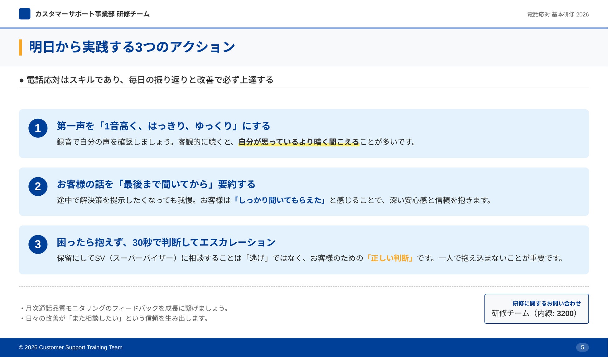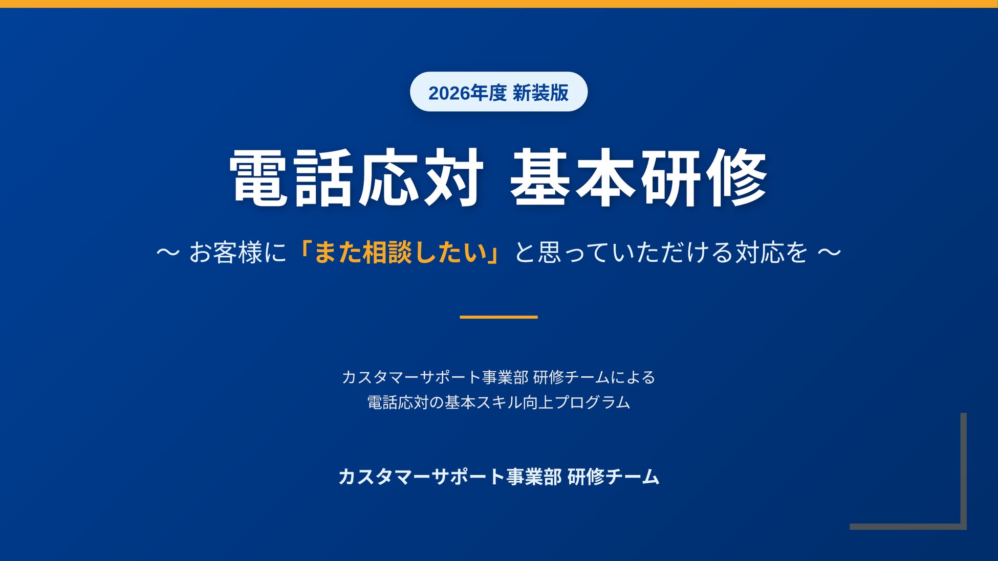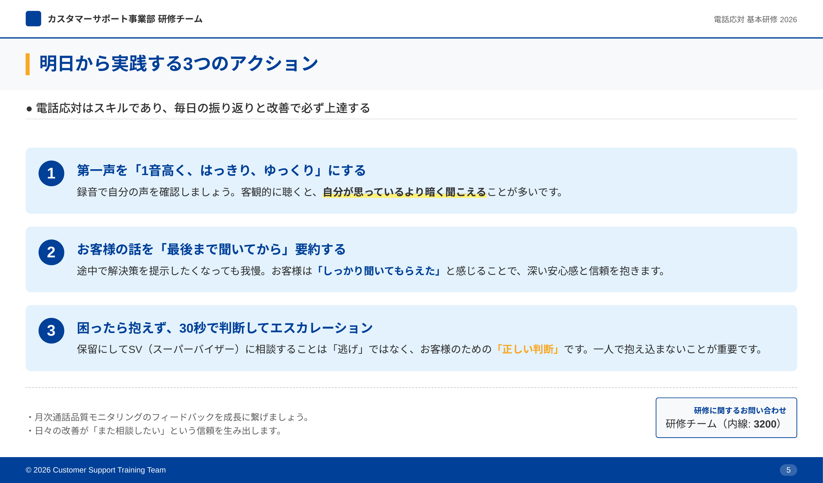 2つ目は「研修スライドのデザインリニューアルスライド」です。既存の堅いテキスト形式の研修教材を、視覚的で親しみやすいスライドへ変換できるサンプルです。既存研修テキストやPDFを素材として投入するだけで、コールセンターやBPO現場の受講者向けに視覚的でわかりやすいスライドへリニューアルすることが可能です。受講者の理解度や学習意欲を高めるとともに、研修担当者のリデザイン工数を大幅に削減できます。