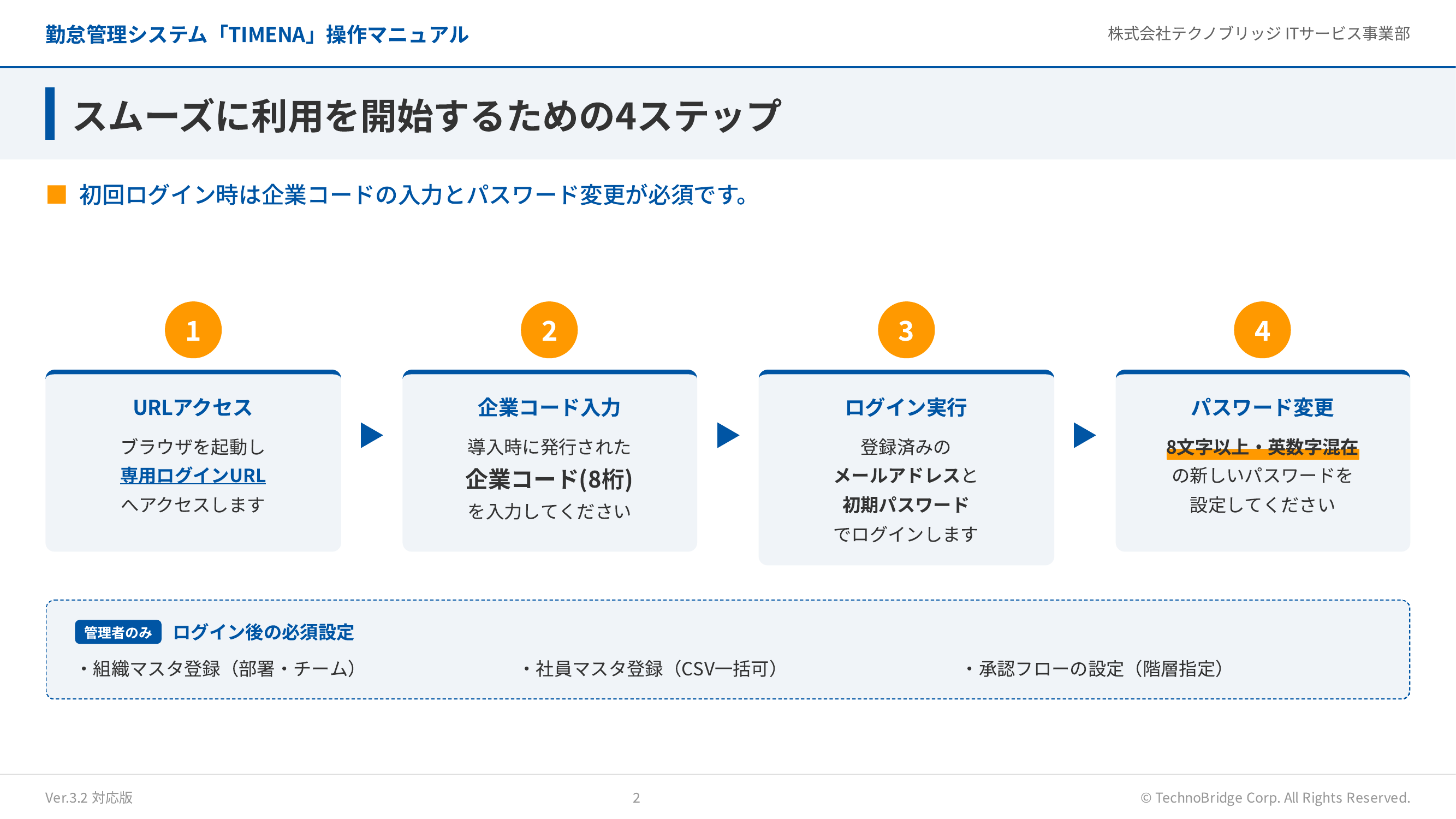 今回、このスライド生成機能にコンサル・BPO・SIer企業向けのサンプルスライドを新たに追加しました。サンプルスライドをテンプレートとして選択することで、用途に合ったデザイン・構成のスライドをすぐに作成開始することが可能です。たとえば、システム導入時のマニュアル説明資料を作成したい場合、該当するサンプルスライドを選び、Word形式のマニュアルをアップロードするだけで、要点が整理されたスライドが自動生成されます。専門的なデザインスキルがなくても、高品質なスライドや動画を制作できるため、提案・マニュアル・研修といった現場で発生する資料作成の負担を軽減します。
