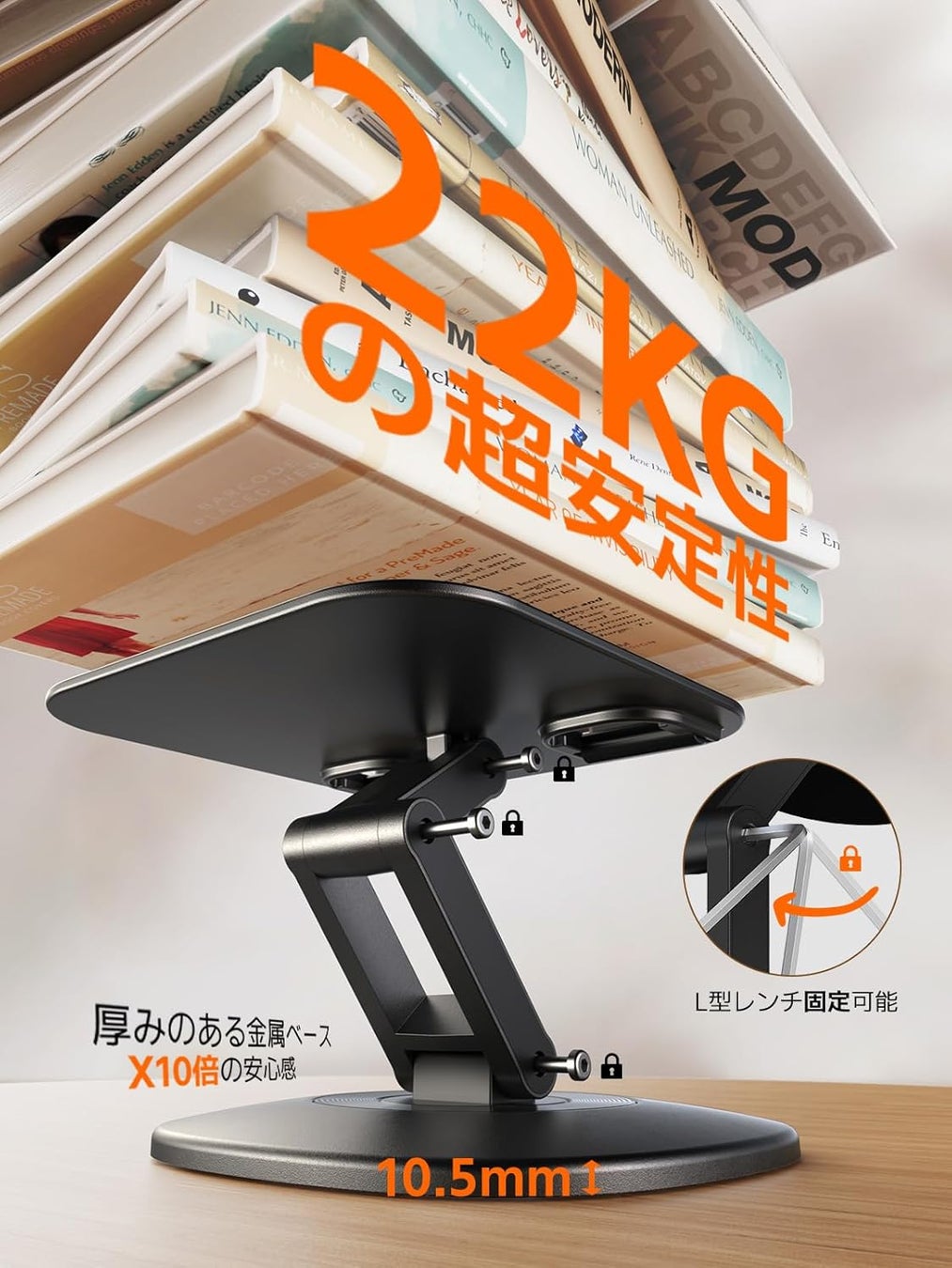 このiPadスタンドは、10.5mmの金属加厚ベースと4層精密構造(強化分子、ナノ吸着層、炭素鋼ベース、EVE滑り止めシリコン)により、プラスチック製品に比べ安定性が10倍向上!最大22KGの耐荷重で、揺れや傾きを完全に防ぎます。さらに、接触面積は85%拡大し、付属のL型レンチで簡単に固定可能。長時間使用でも安心です。このタブレットスタンドを一度使えば、他の製品はもう必要なくなるでしょう!