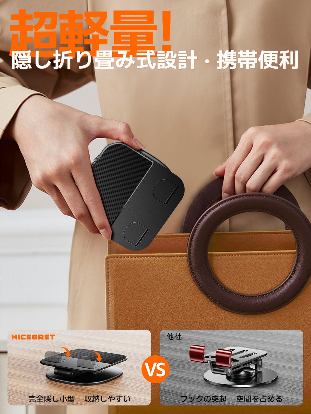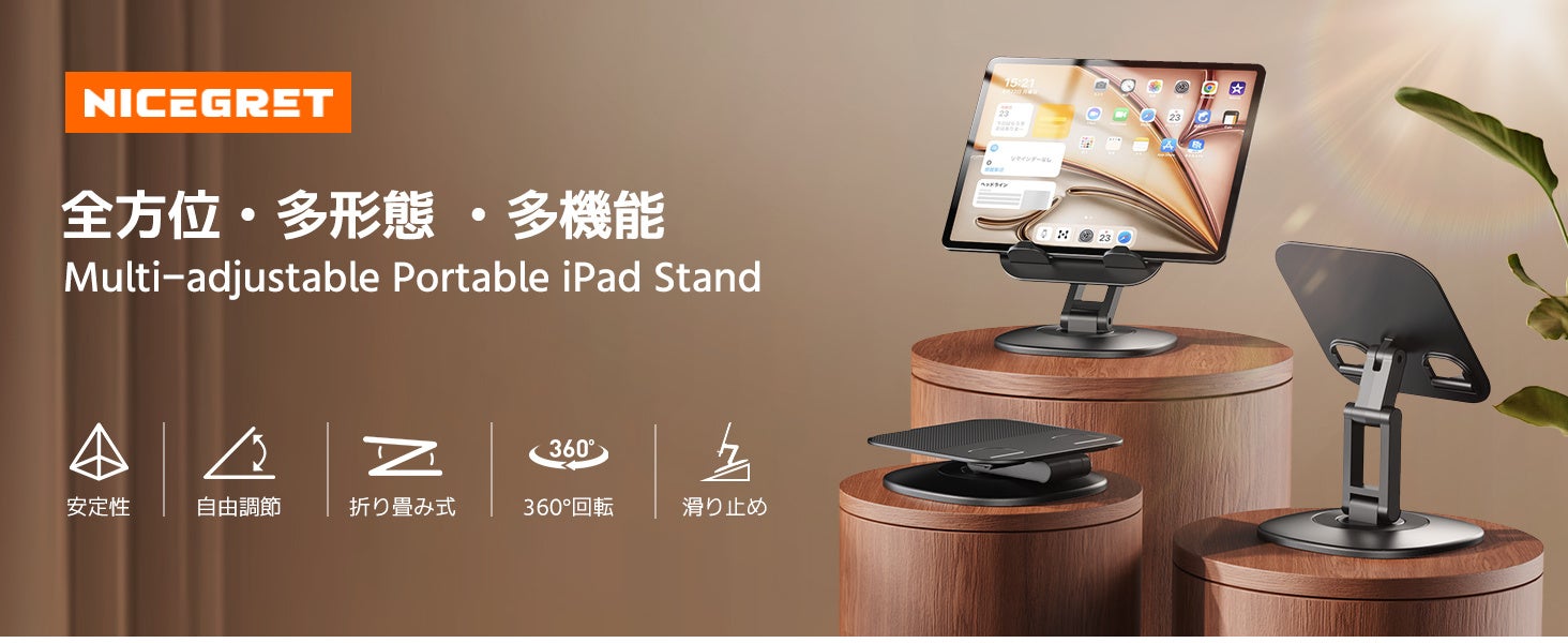 iPadを使っていると、視野の角度が合わずに姿勢が悪くなる、安定しない場所に置いて滑り落ちる、といった問題に悩まされたことはありませんか?そんな不便を解消するために、NICEGRETは「完全隠し折りたたみ式iPadスタンド」をご紹介します。3軸の自由な角度調整と360°回転が可能で、理想の視点を簡単に実現。折りたたむとデスク上で完全に隠れ、持ち運びにも便利なコンパクト設計です。快適でスマートなデバイス体験を、このスタンドでぜひお試しください!