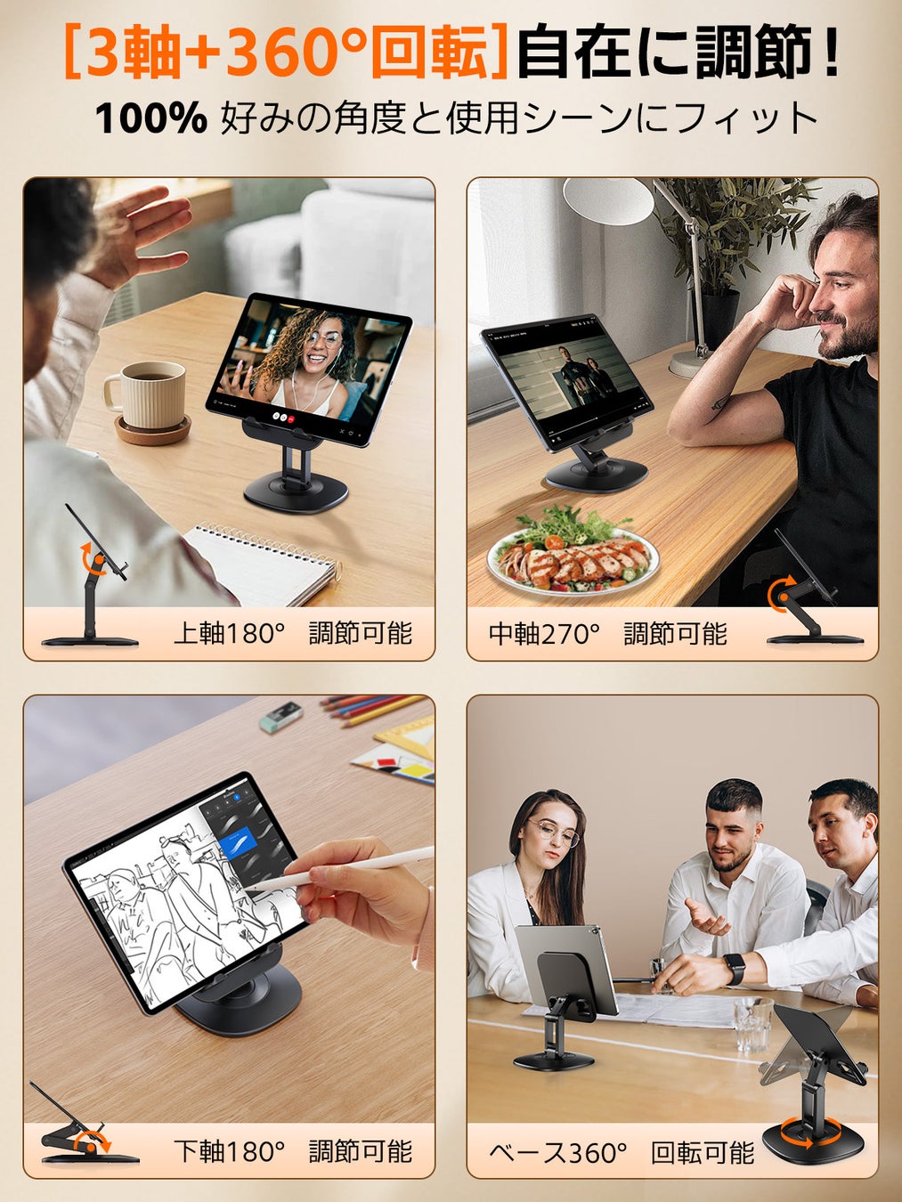 このiPadスタンドは、100%あらゆる角度とシーンに対応します。上軸180°、中軸270°、下軸180°、底座360°回転と、各関節の可動性を最大限に発揮。また、L型レンチで簡単に角度調整が可能で、操作はスムーズで快適です。動画通話、イラスト制作、リモートワーク、映画鑑賞、ヨガやストレッチ、FPSゲームなど、さまざまなシーンで活躍。この自由調節可能なタブレットホルダーは、きっとあなたの日常に欠かせない存在となるでしょう。