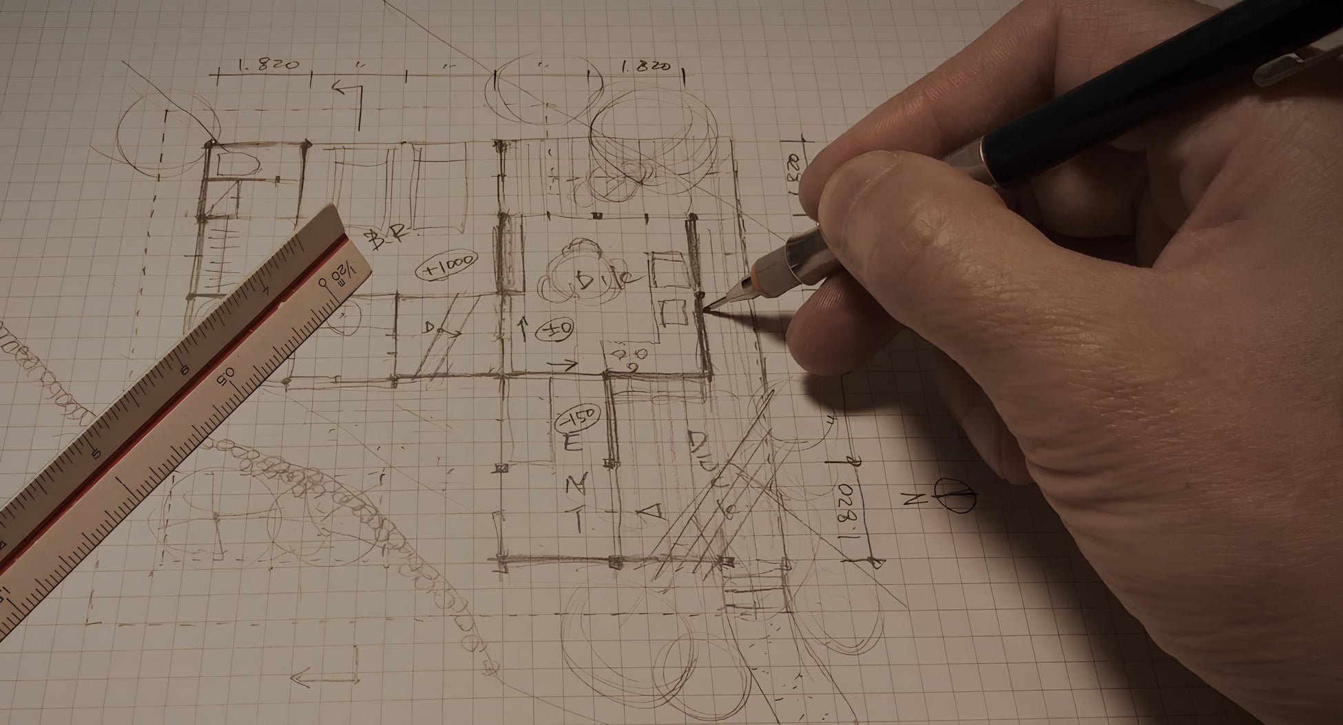 PCやCADは使用しません。日本の伝統的な寸法体系である「一間(約1.818m)」のマス目(グリッド)を用いた設計手法「一間間(いっけんま)グリッド設計法」を学びます。 講師には、ルスカデザイン建築設計事務所 代表の和氣 正頼氏を迎え、「デザインはセンスではなく技術である」という指導のもと、未経験者でも論理的に美しい空間構成を身につけることができます。