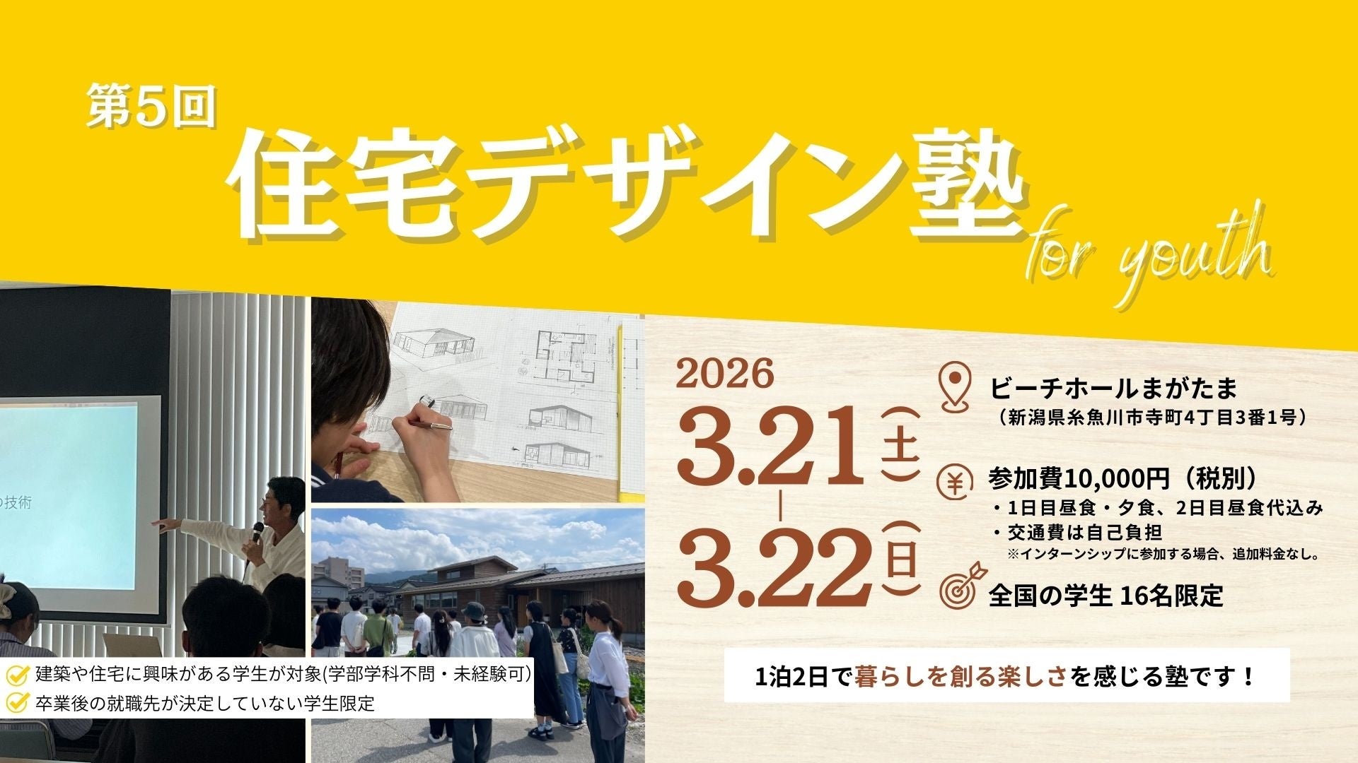 新潟県上越・糸魚川地域で「暮らしワンストップサービス」を展開する株式会社カネタ建設(本社:新潟県糸魚川市、代表取締役:猪又 直登、以下「カネタ建設」)は、全国の学生を対象とした実践型ワークショップ「第5回 住宅デザイン塾 for youth」を、2026年3月21日(土)~22日(日)の2日間、新潟県糸魚川市にて開催いたします(運営サポート:株式会社Asian Bridge)。