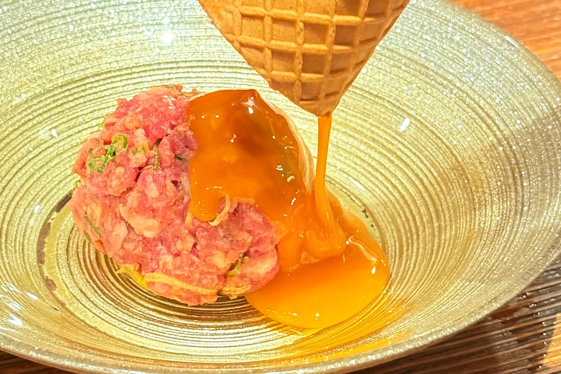 新商品「馬肉アイス」は、コーンに乗ったアイスクリームのような見た目ですが、乗っているのは馬肉のユッケ。馬肉専門店の当店でも人気の馬肉ユッケを、よりわくわく楽しんでいただけるユニークな一皿に仕上げました。