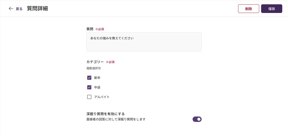 質問ごとに、新卒/中途/アルバイトのいずれで使用するかを設定できます。