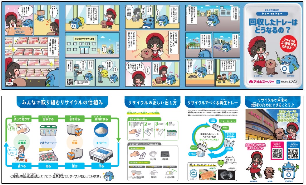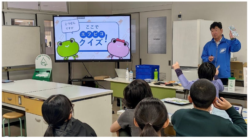 食品容器製造メーカーのエフピコによる『トレーtoトレー』の水平リサイクル(店頭で回収した食品トレーを新たな食品トレーに生まれ変わらせる資源循環の仕組み)について、当社オリジナルのリーフレットを使いながら、まんがで楽しく学べる授業を実施