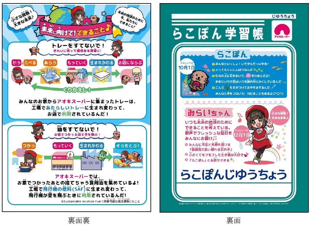 アオキスーパーでは、子ども達が身近に環境問題を意識しつつ、より一層楽しみながら学ぶことができるよう、それぞれの授業のテーマについて分かりやすくまとめた『らこぽん学習帳』を制作し、出前授業で活用しています。
