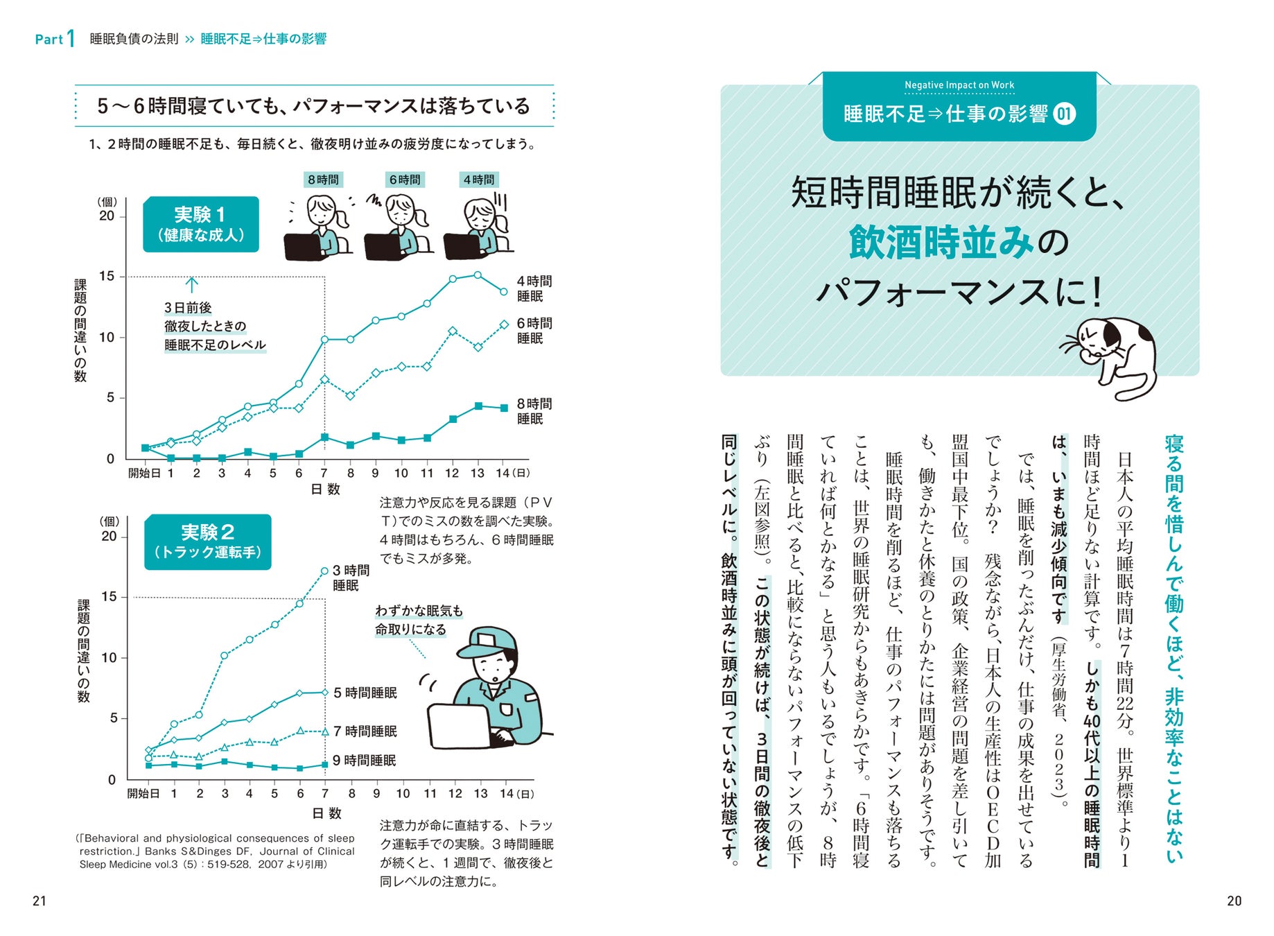 睡眠時間の世界平均8時間25分に対し、日本人の平均は7時間22分。さらに30代~50代では半数近くの人が6時間未満という世界トップクラスの寝不足。睡眠負債の影響、しっかり眠ることのメリット、快眠のコツまで、働く世代が気になる情報がこの一冊でわかります。