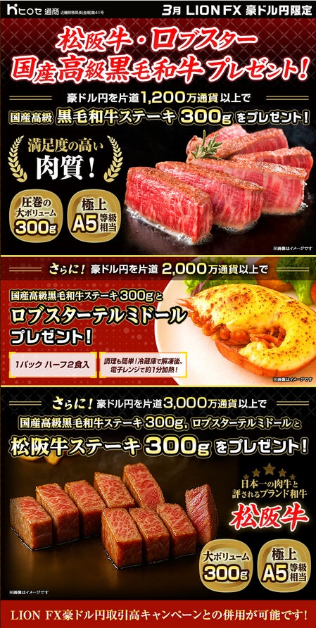 ヒロセ通商株式会社 (本社:大阪府西区、代表取締役:野市 裕作、以下:当社)は、当社の提供する「LION FX」において、2026年3月2日(月)より、「LION FX豪ドル円限定 松阪牛・ロブスター・国産高級黒毛和牛プレゼントキャンペーン」を実施することをお知らせいたします。