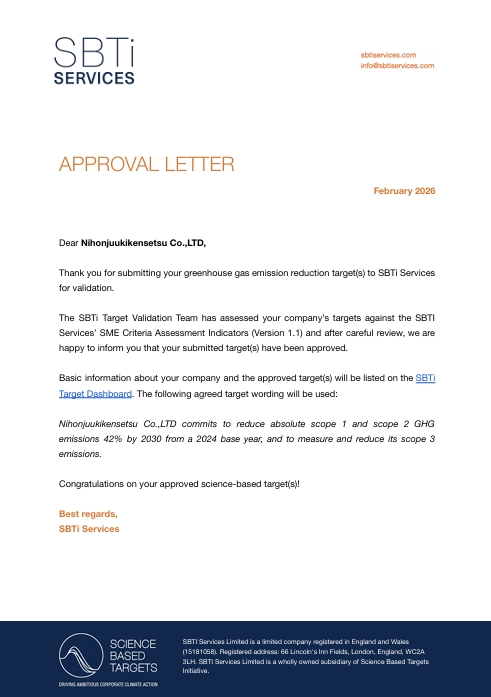 【脱炭素への取組み】日本ジュウキケンセツ株式会社による「SBT認定取得」のお知らせ