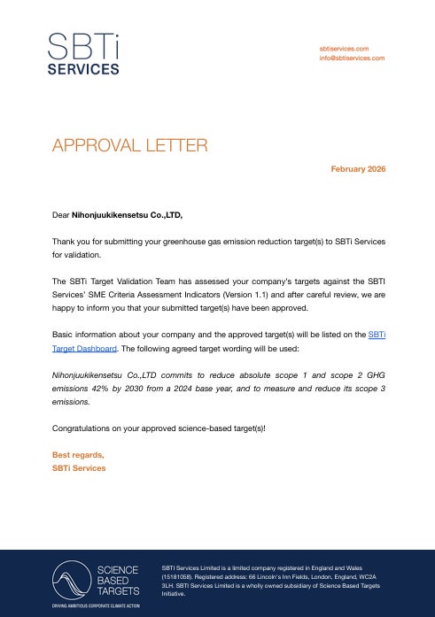 この度、本サービスを通じて日本ジュウキケンセツ株式会社(以下「同社」という)がGHGプロトコル(※2)にもとづき自社の温室効果ガス排出量となるScope1、Scope2(※3)を算定し、掲げた削減目標がSBT(※4)認定(中小企業向け)を取得しましたのでお知らせします。