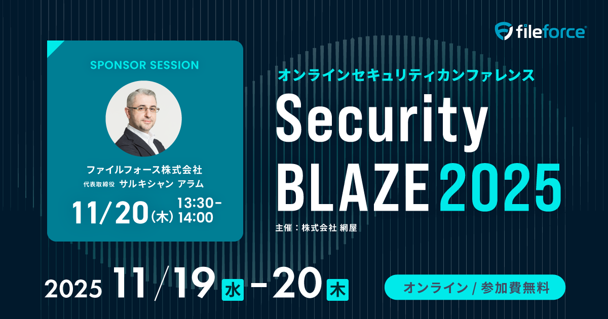 クラウドストレージ「Fileforce」を提供するファイルフォース株式会社(本社:東京千代田区 代表取締役:サルキシャン アラム)は、株式会社網屋(本社:東京都中央区 代表取締役社長 石田 晃太)主催のカンファレンス「SecurityBLAZE 2025」のDAY2|11月20日(木)13:30–14:00のスポンサー講演にて、代表取締役 アラム・サルキシャンが登壇いたします。
