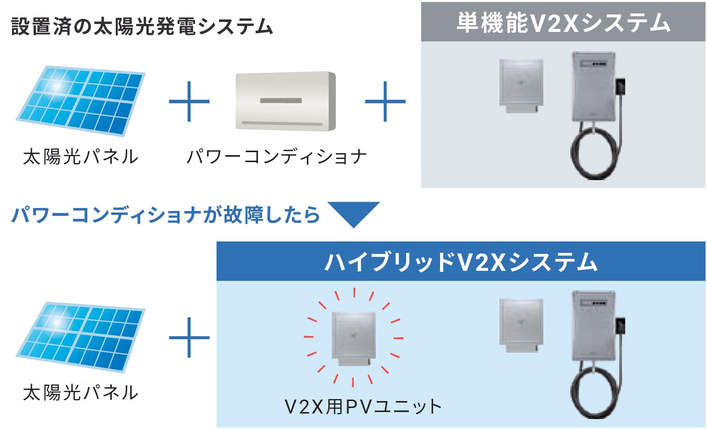 既に太陽光発電システムが設置されている住宅にも簡単後付けで設置できます。既設の太陽光発電システムをそのまま使われる場合は、従来と同様に単機能V2Xシステムとして併設活用。後に太陽光発電システムのパワーコンディショナが故障した時点でV2X用PVユニットに置き換えることで、ハイブリッドV2Xシステムへステップアップさせることが可能です。段階的な導入ができるため、初期費を抑えながら住環境に合わせた最適な活用ができます。