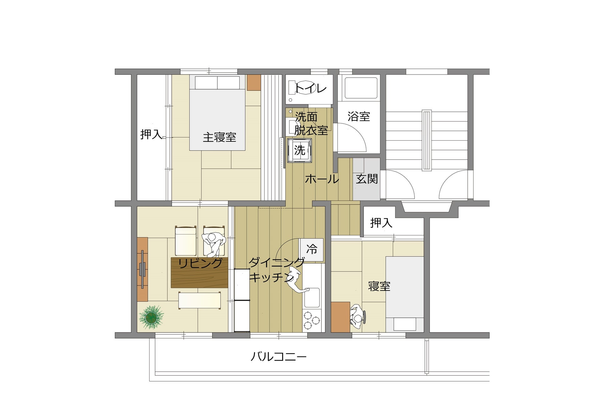 特徴:ふすまを取り外すことで一室空間とすることができ、住む人のライフスタイルに合わせて簡単に間取りを変化させることができます。はずしたふすまは「ふすま収納」へ収納できます。