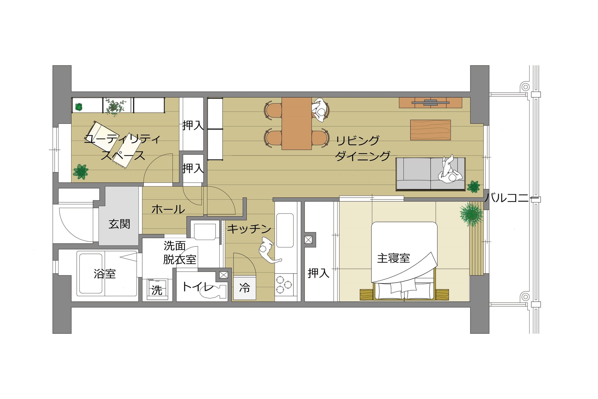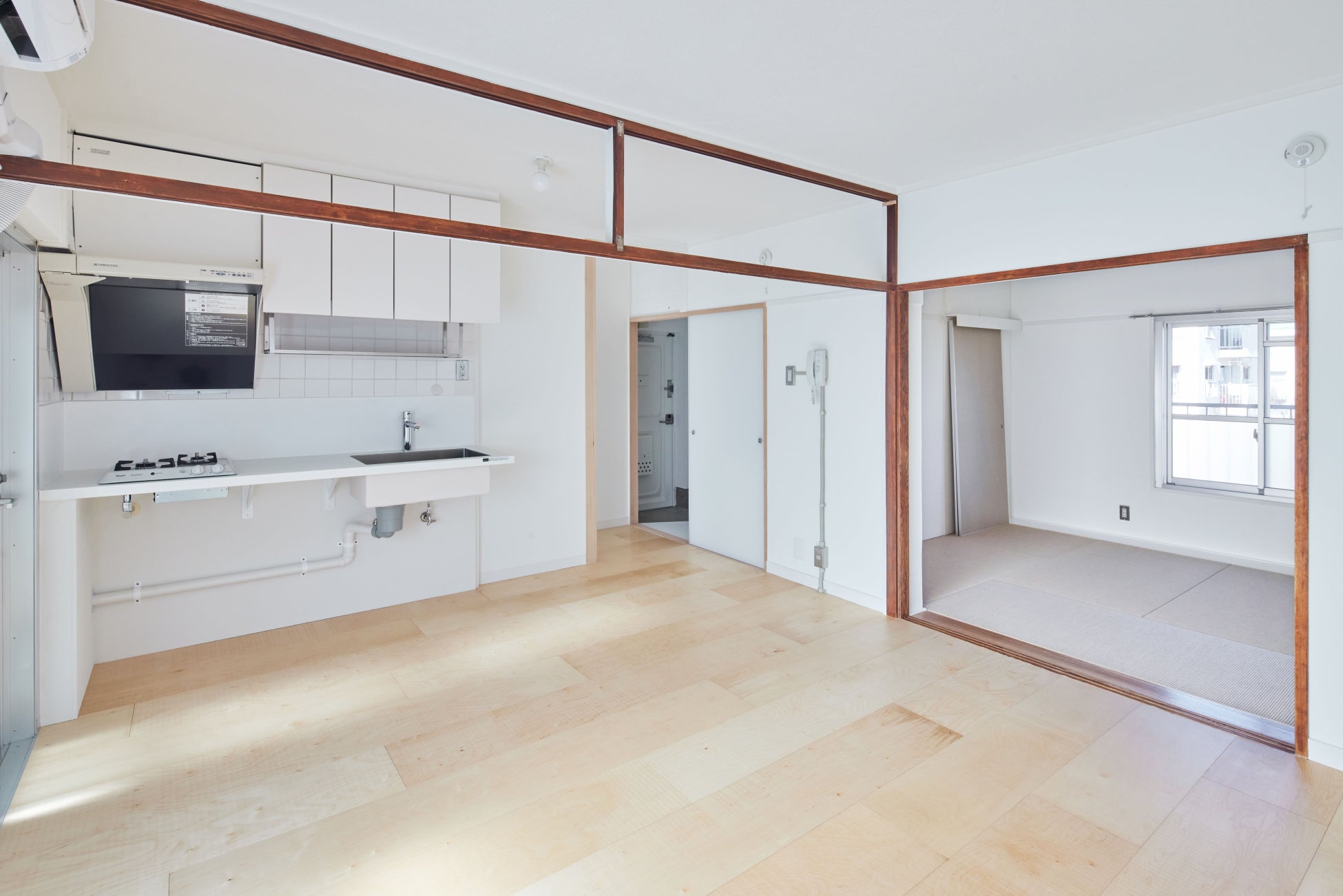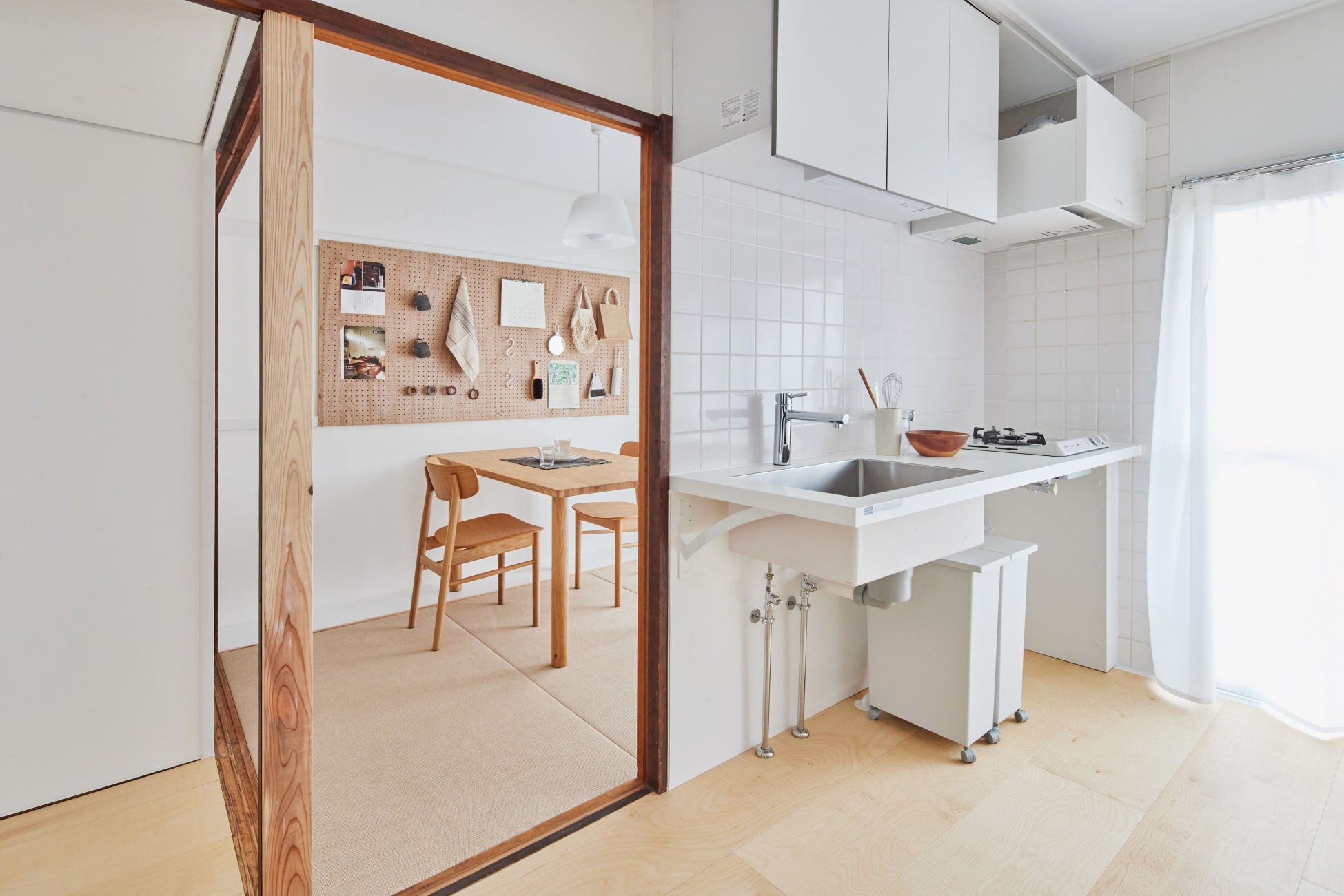 特徴:団地ならではの収納力のある押入を残しつつ、ダイニングキッチンと和室の間のふすまを外すことで、広々とした一体空間にすることができます。また、長押を使って自由にアレンジできる壁面が特徴で、水回りを刷新し、使い勝手の良さもプラスしています。
