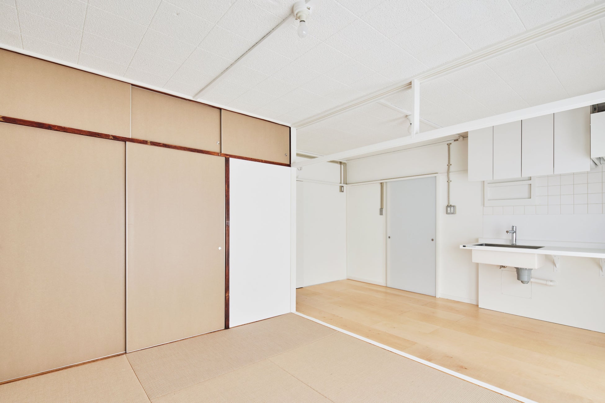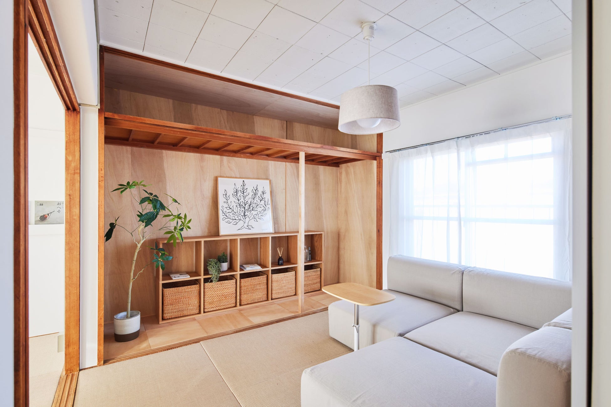 特徴:リビングと南側の部屋を仕切っていたふすまを撤去し、広々としたリビングダイニングを実現しました。一部押入を通り抜け可能としたことで、南北に風が通る気持ちのよい空間に。ふすまは開け閉め可能なので、暮らしに合わせてワークスペース等にご活用いただけます。