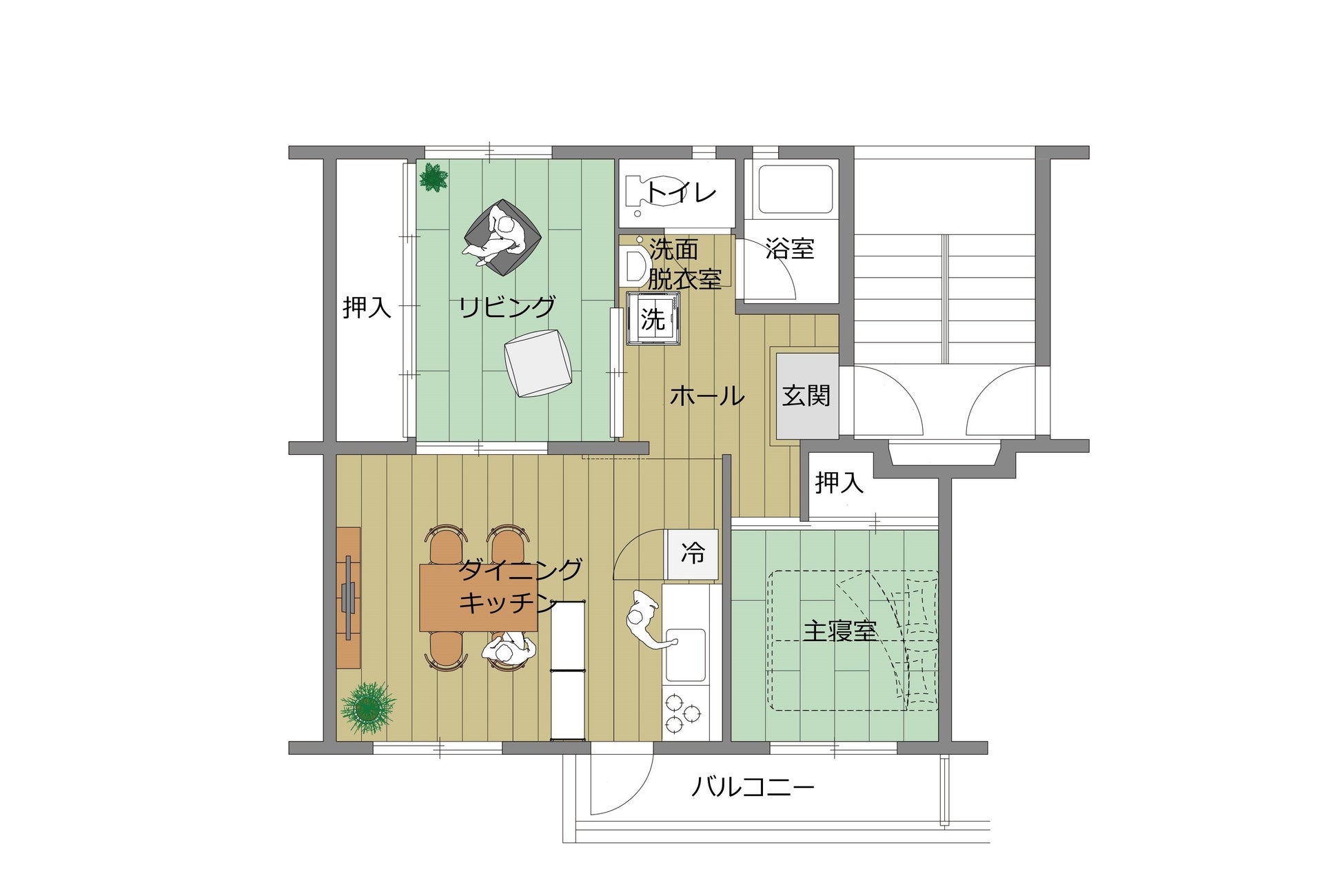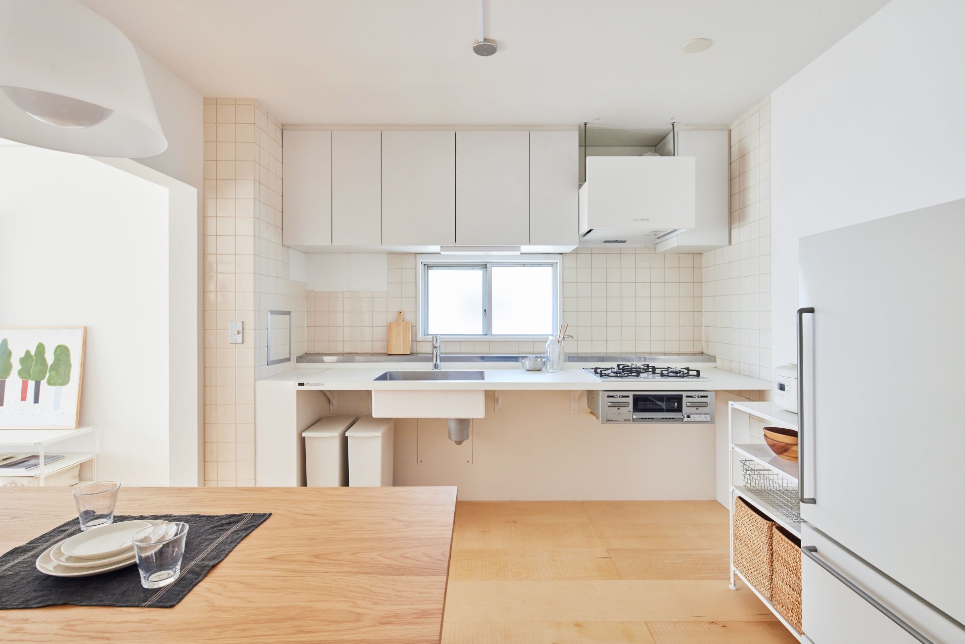特徴:床には木目を活かした白樺の合板フローリングを使用し、木の温もりが感じられる内装としました。キッチンは共同開発パーツの持ち出しキッチンを採用。既存の収納を残すことでストレージ機能も充実させています。