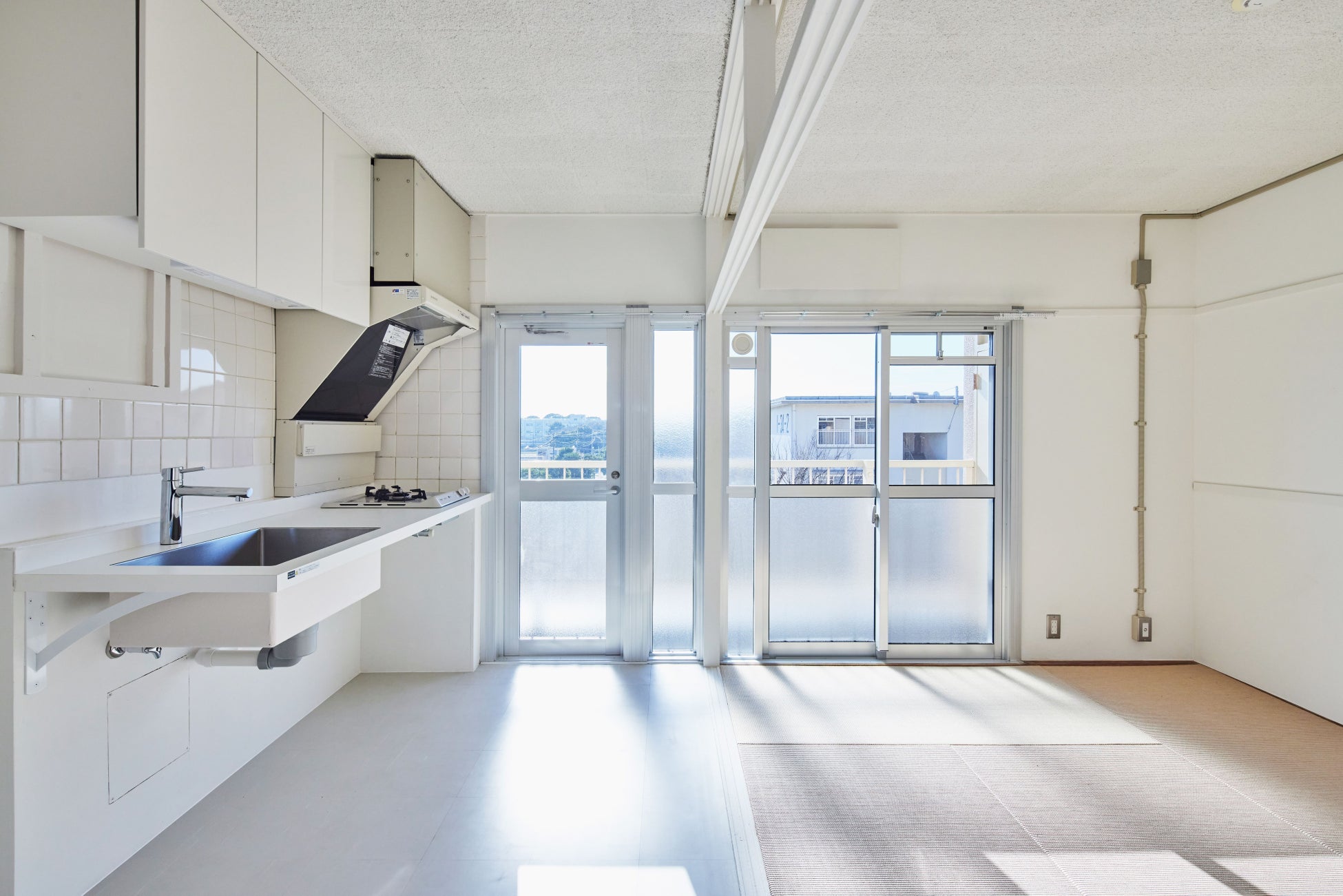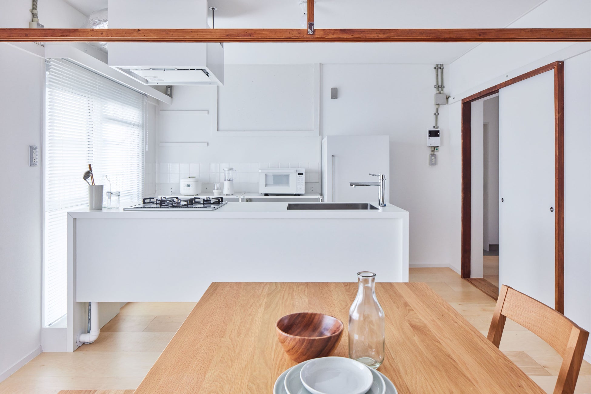特徴:リビングとダイニングの間のふすまを取り外し、白が基調の明るい内装とすることで、バルコニーから差し込む光を活かした、開放感のある空間をつくりました。キッチンは共同開発パーツの持ち出しキッチンを採用しています。