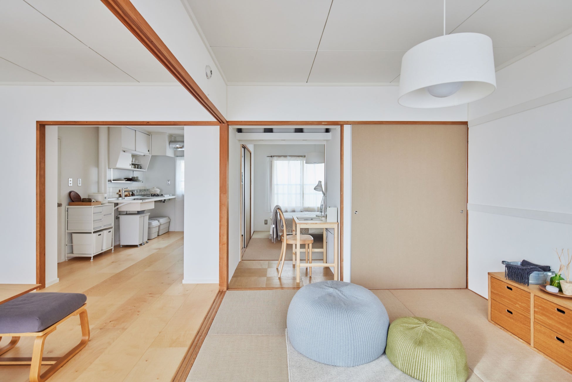 特徴:手狭だった3帖の和室の壁を一部撤去し、キッチン側と一体的に使えるようにしました。また、キッチンとリビングとの境に設置した半透明ふすまによって、空間全体にやわらかい光を取り込みます。